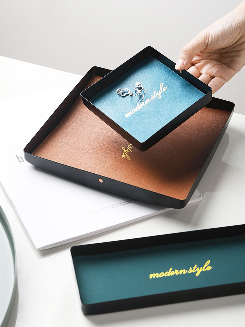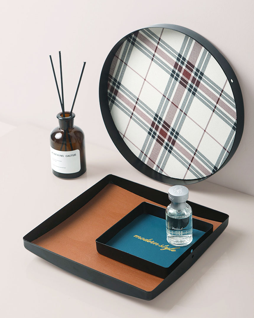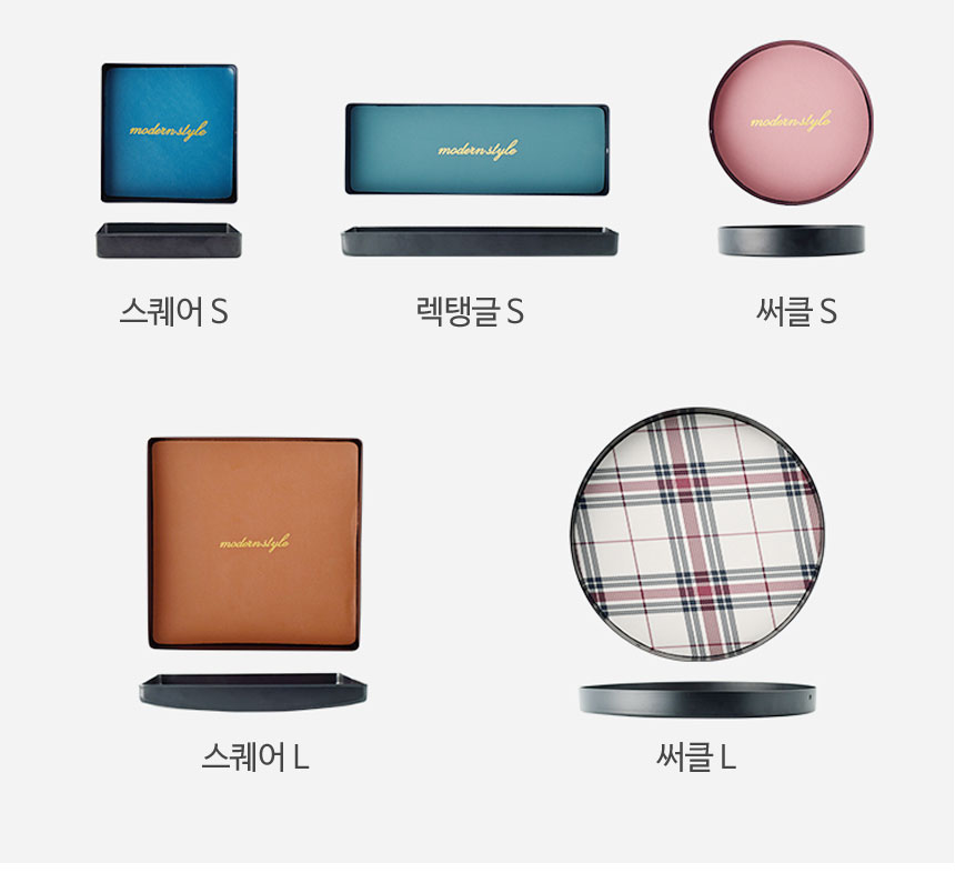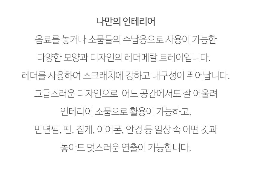 나만의 인테리어 음료를 놓거나 소품들의 수납용으로 사용이 가능한 다양한 모양과 디자인의 레더메탈 트레이입니다. 레더를 사용하여 스크래치에 강하고 내구성이 뛰어납니다. 인테리어 소품으로 활용이 가능하고, 만년필, 펜, 집게, 이어폰, 안경 등 일상 속 어떤 것과 놓아도 멋스러운 연출이 가능합니다.