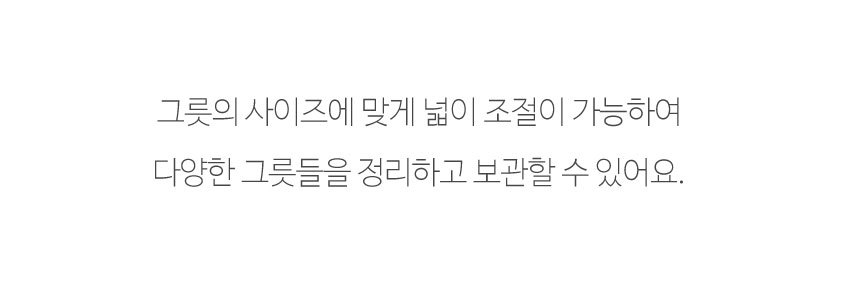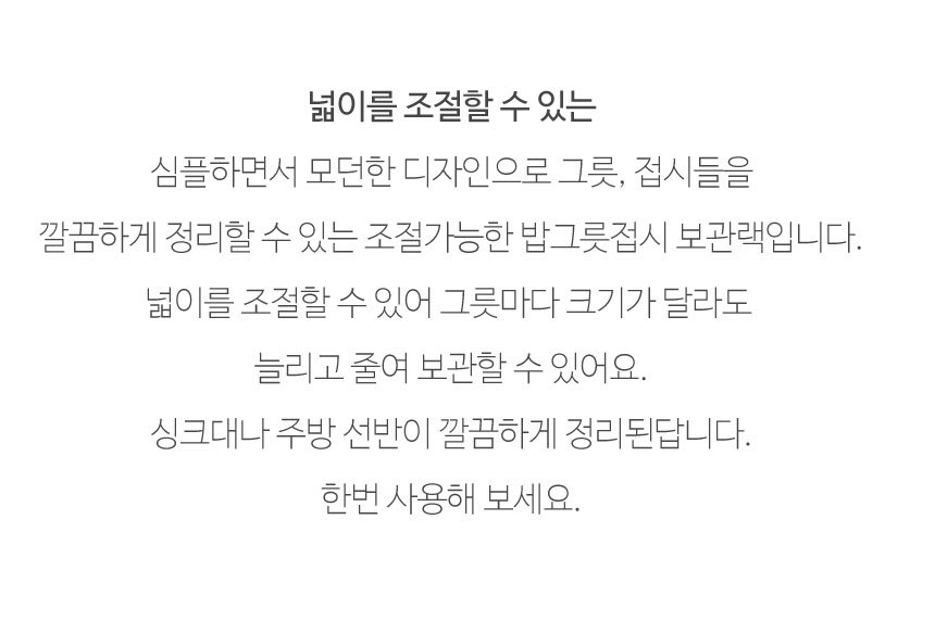 넓이를 조절할 수 있는 심플하면서 모던한 디자인으로 그릇, 접시들을 깔끔하게 정리할 수 있는 조절가능한 밥그릇접시 보관랙입니다. 넓이를 조절할 수 있어 그릇마다 크기가 달라도 늘리고 줄여 보관할 수 있어요. 싱크대나 주방 선반이 깔끔하게 정리된답니다. 한번 사용해 보세요.