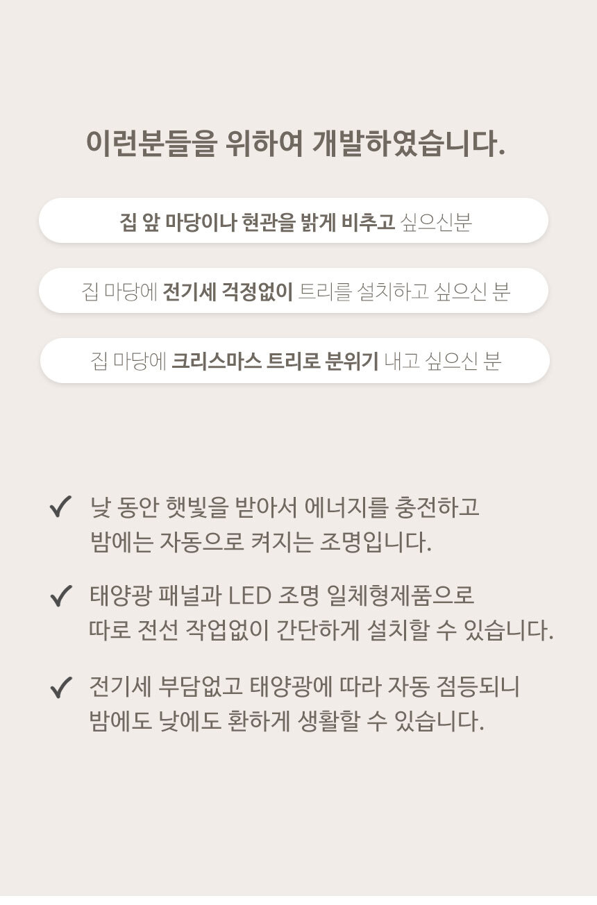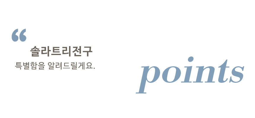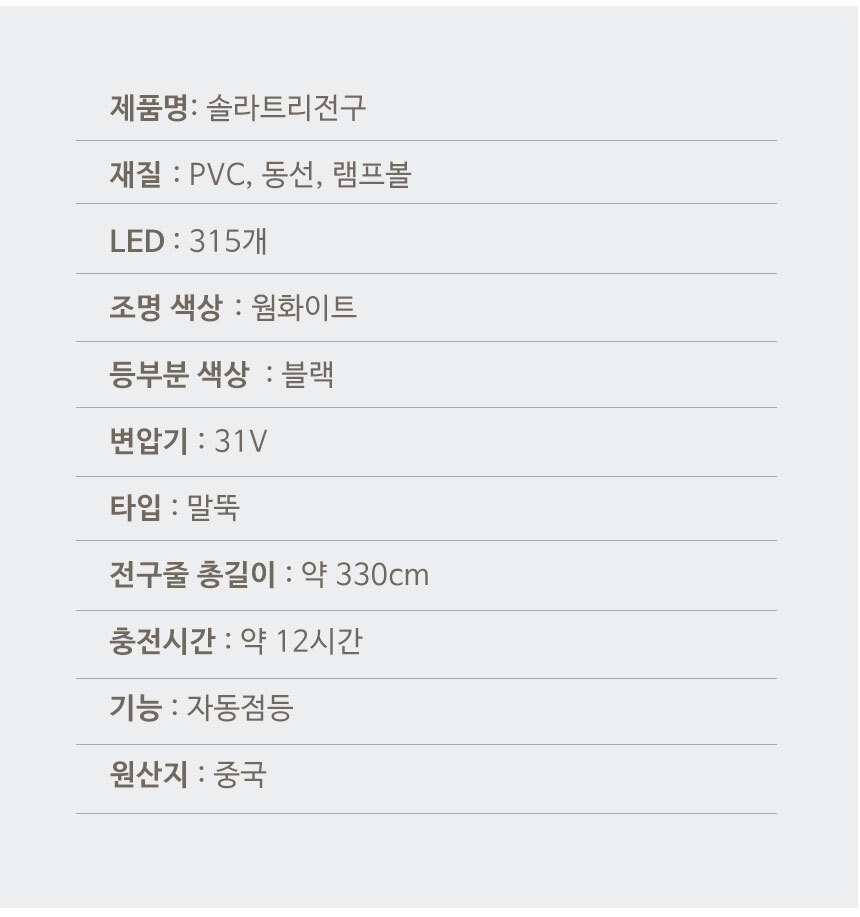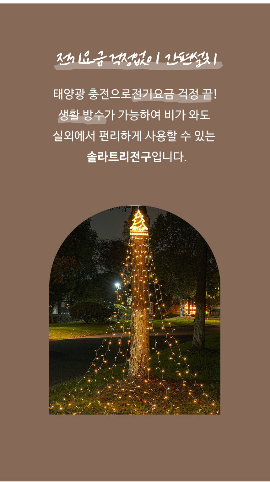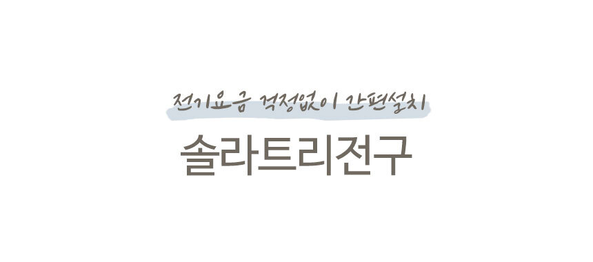전기요금 걱정없이 간편설치 태양광 충전으로 전기 요금 걱정 끝 생활 방수가 가능하여 비가 와도 실외에서 편리하게 사용할 수 있는 솔라트리전구입니다.