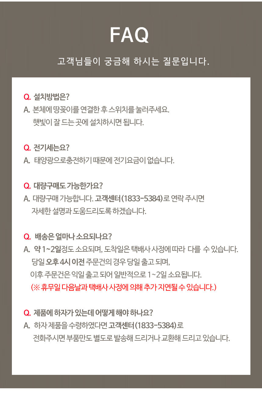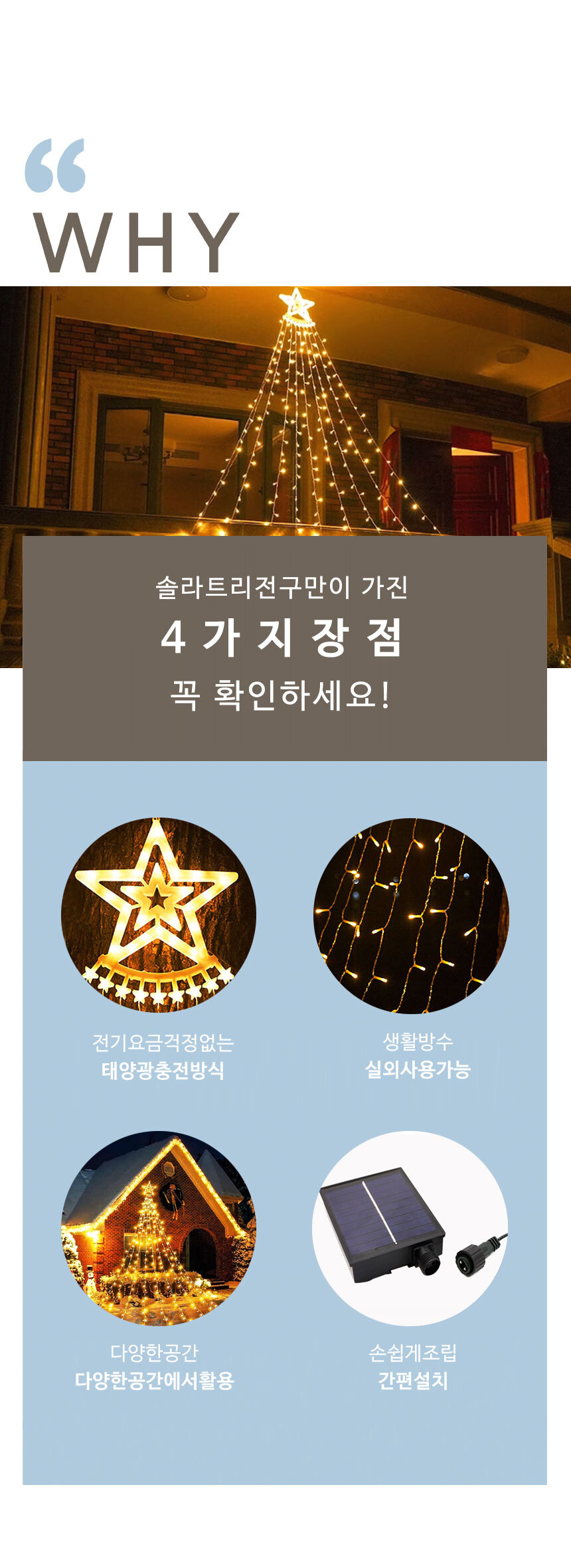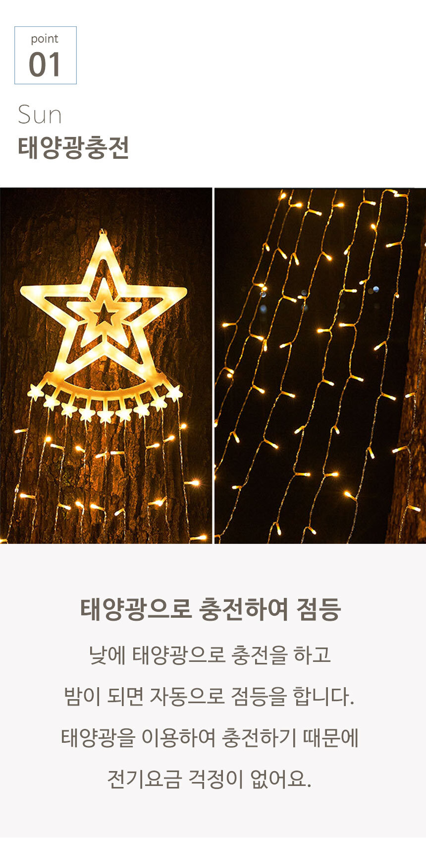 전기요금 걱정없이 간편설치 태양광 충전으로 전기 요금 걱정 끝 생활 방수가 가능하여 비가 와도 실외에서 편리하게 사용할 수 있는 솔라트리전구입니다.