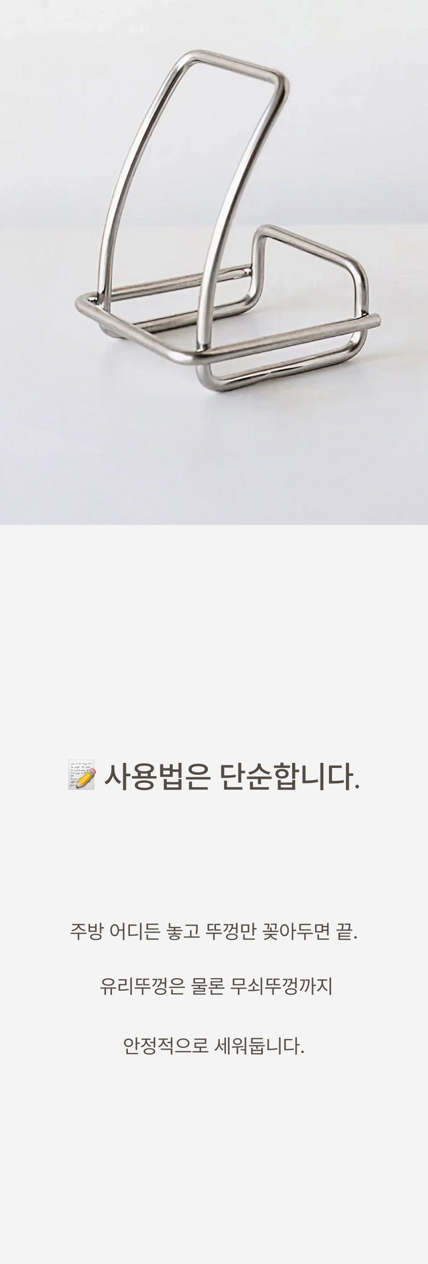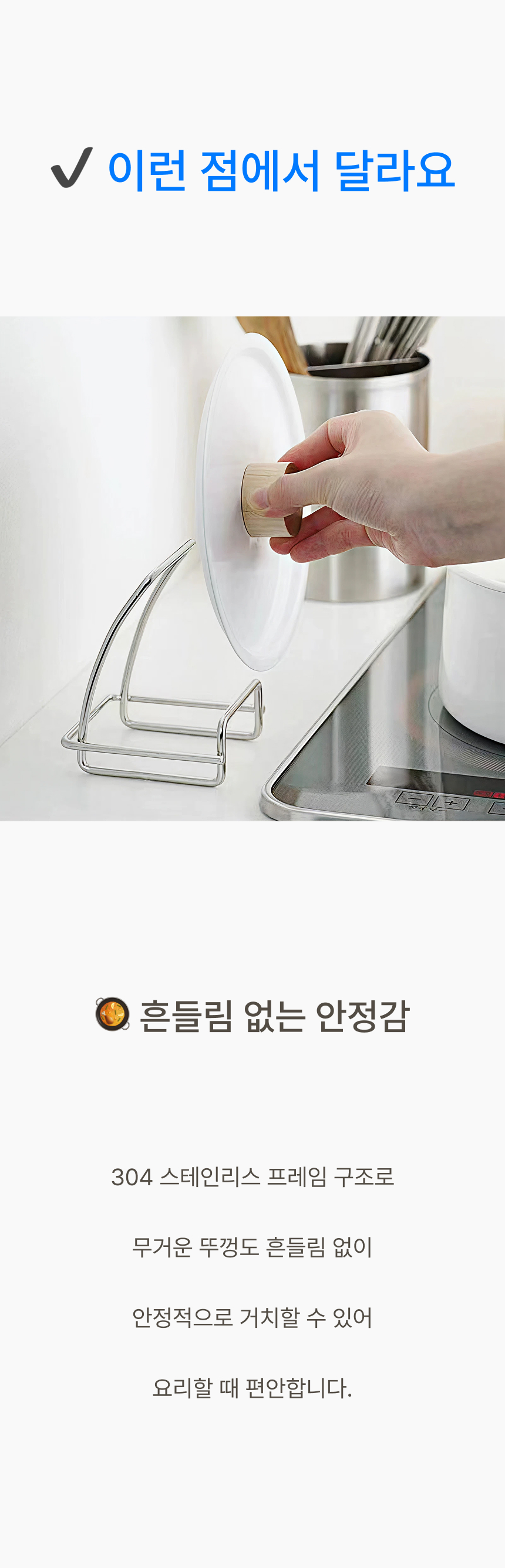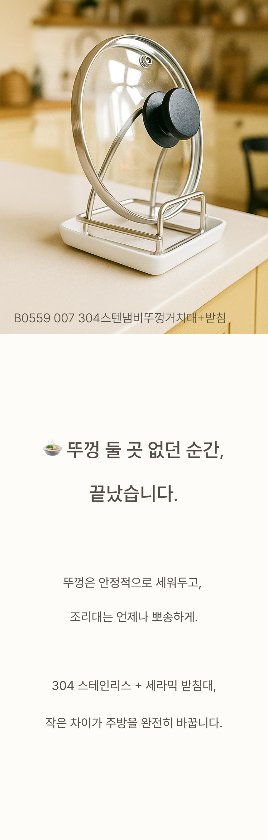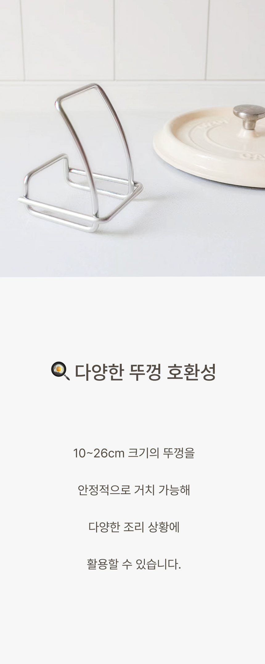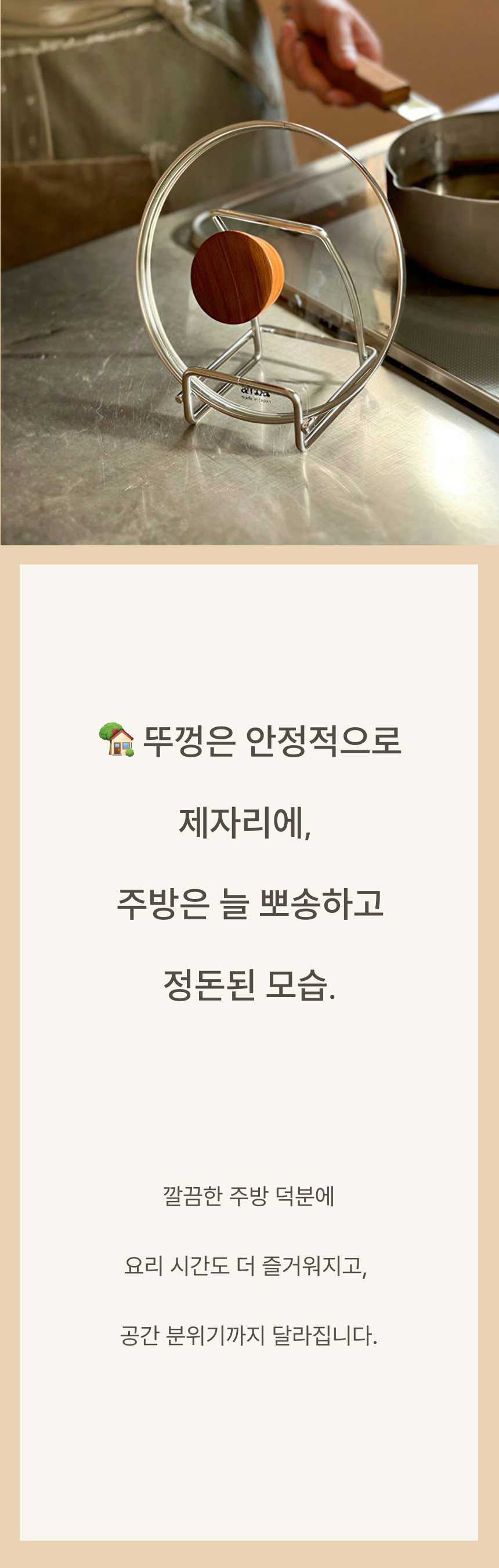조리대가 넓어져 여유로워요. 흩어진 냄비뚜껑, 예쁘게 정돈돼요. 젖은 뚜껑, 위생적으로 보관 가능해요. 가볍게 닦고 늘 쾌적하게 써요.