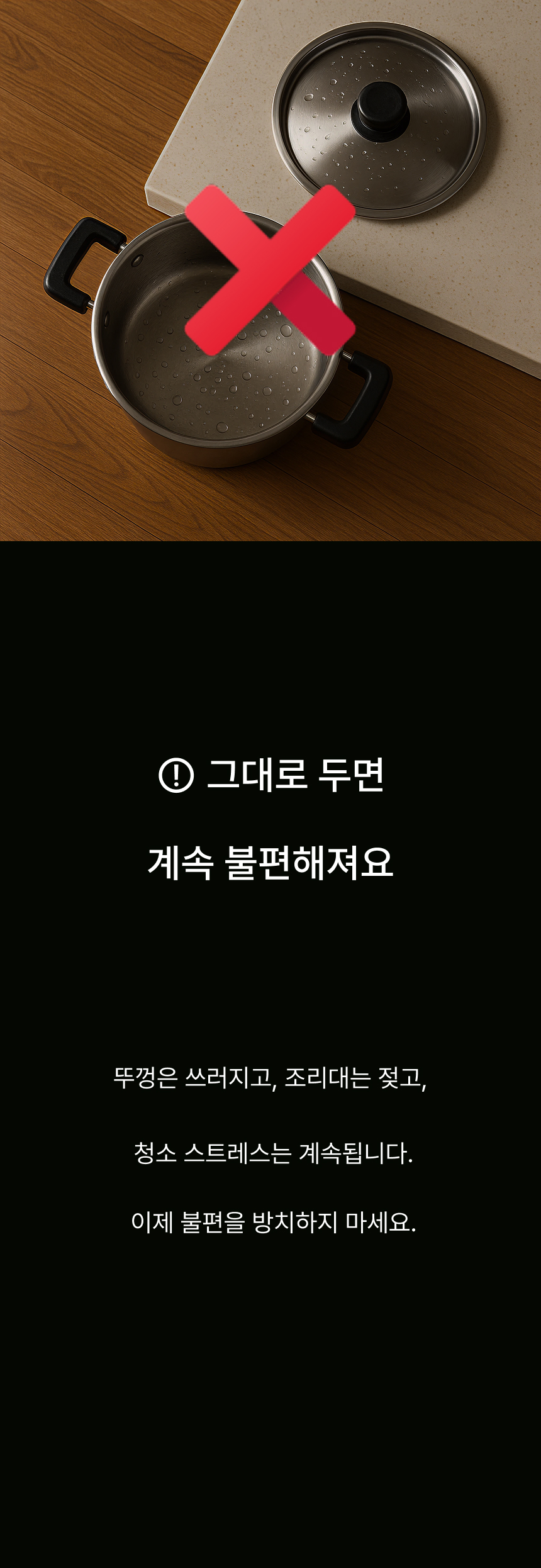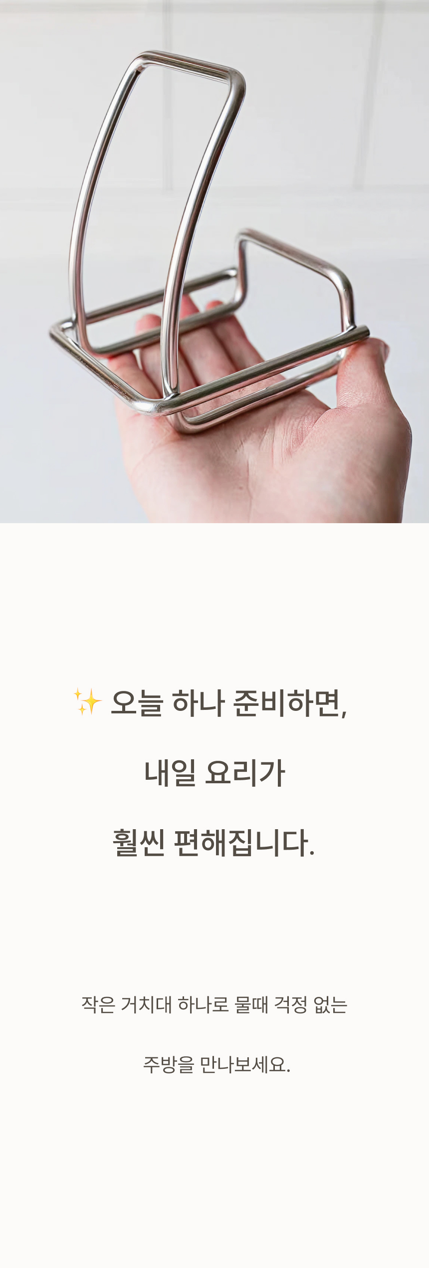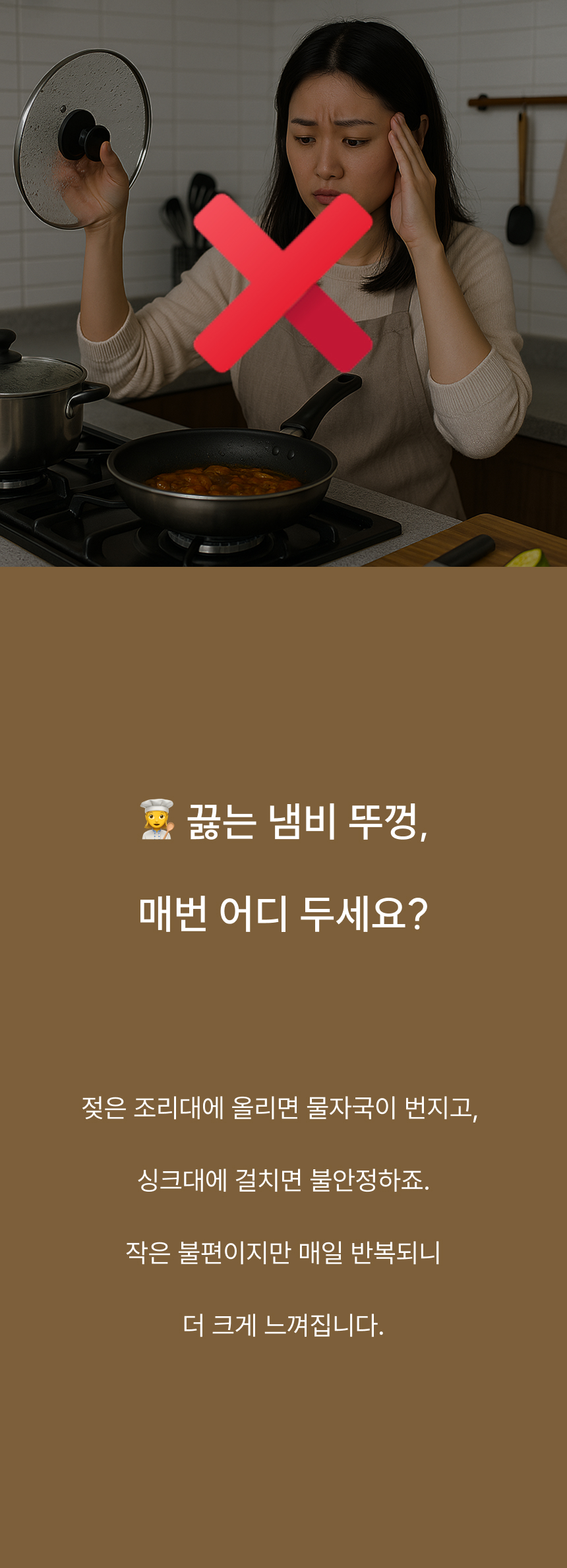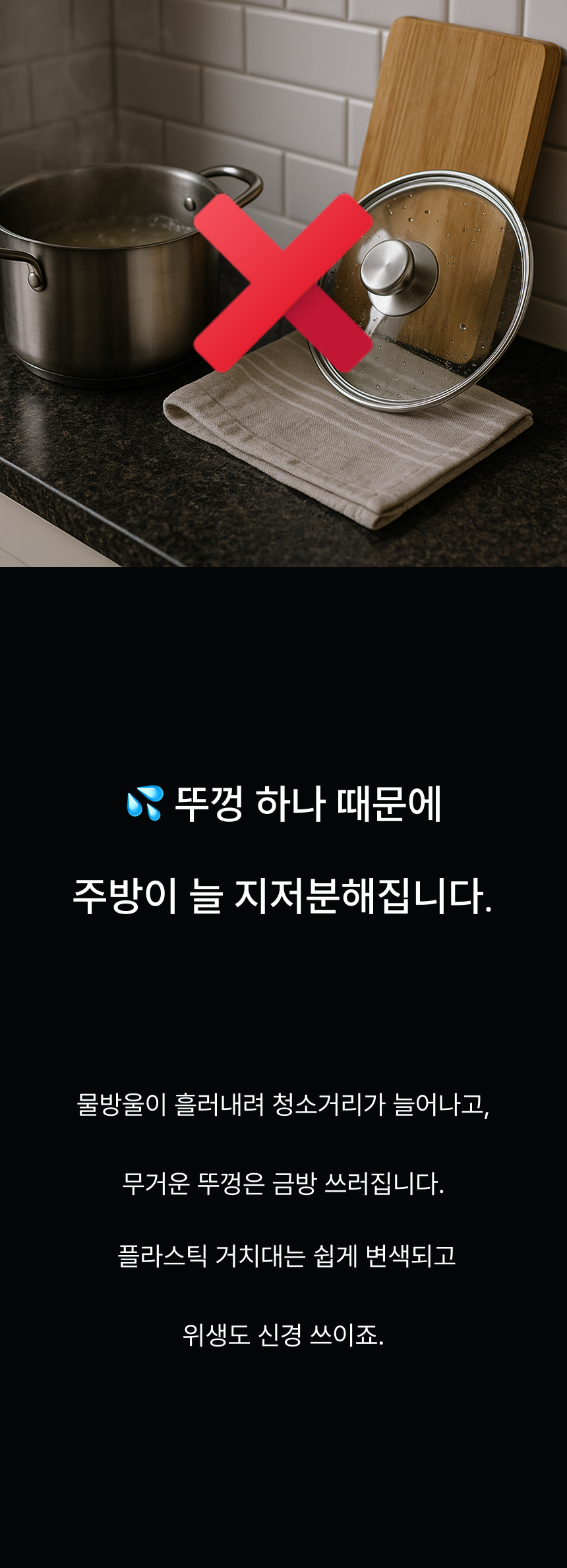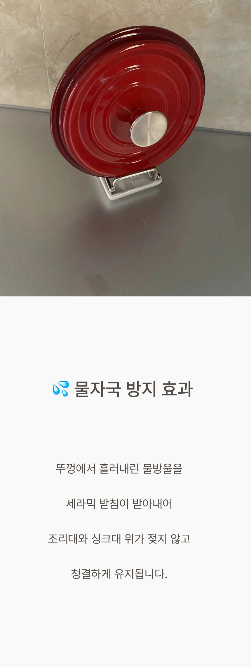 조리대가 넓어져 여유로워요. 흩어진 냄비뚜껑, 예쁘게 정돈돼요. 젖은 뚜껑, 위생적으로 보관 가능해요. 가볍게 닦고 늘 쾌적하게 써요.