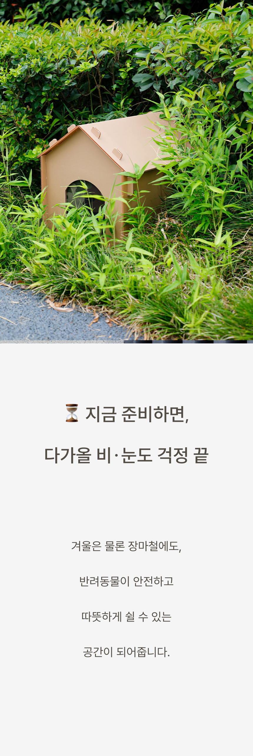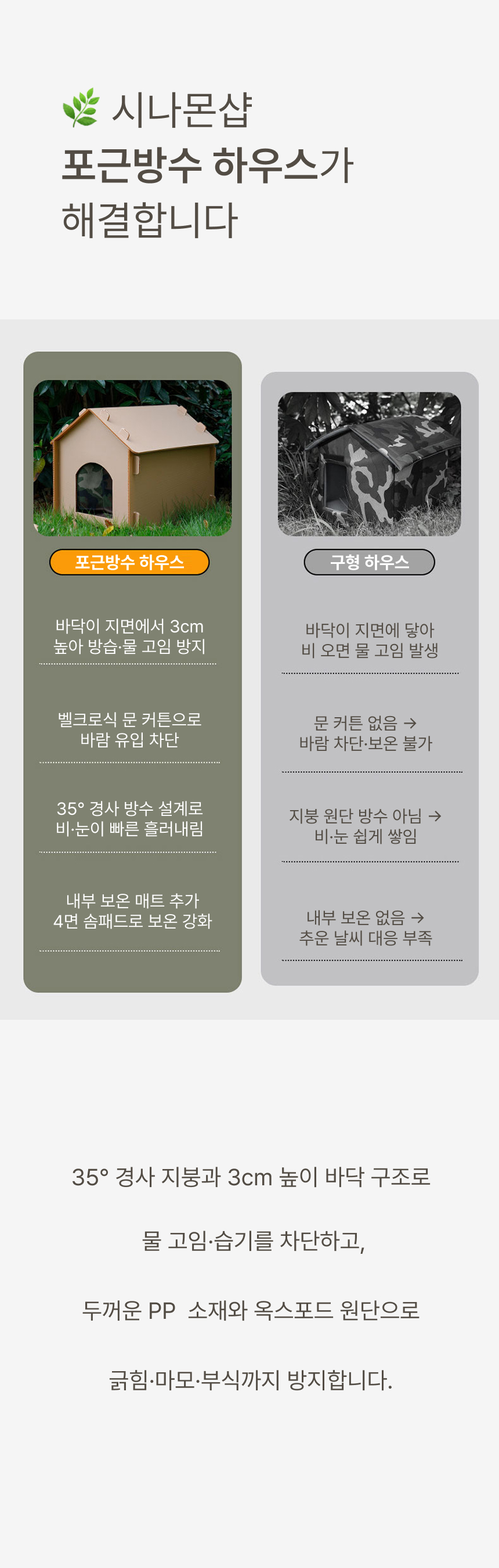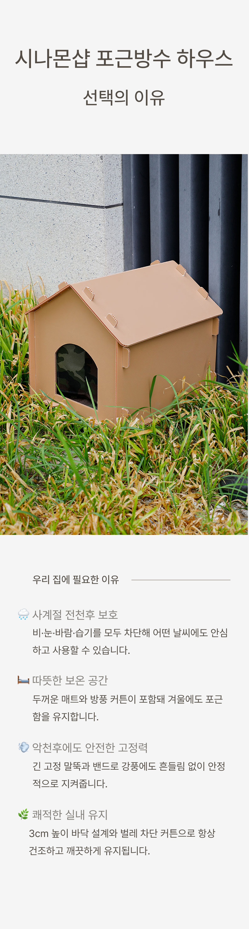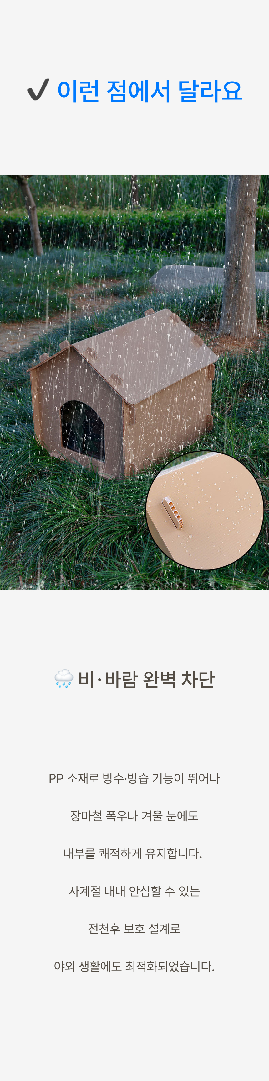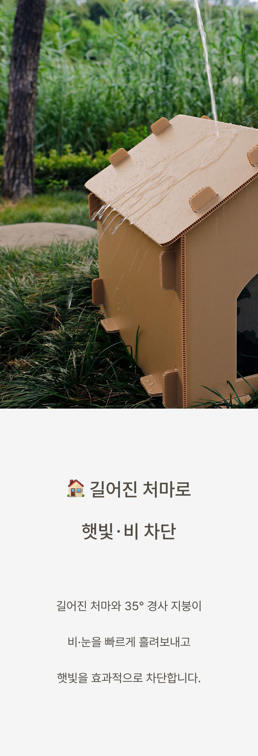 경사 지붕과 높은 바닥 구조로 물 고임, 습기를 차단하고 두꺼운 PP소재와 옥스퍼드 원단으로 긁힘, 마모, 부식까지 방지하는 포근방수 펫하우스입니다.
