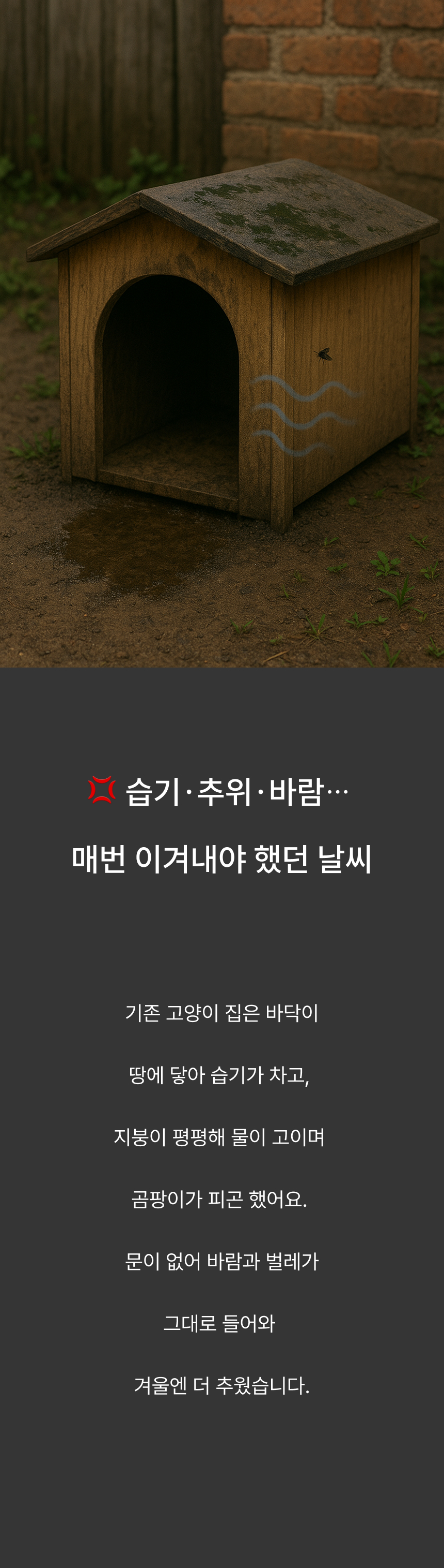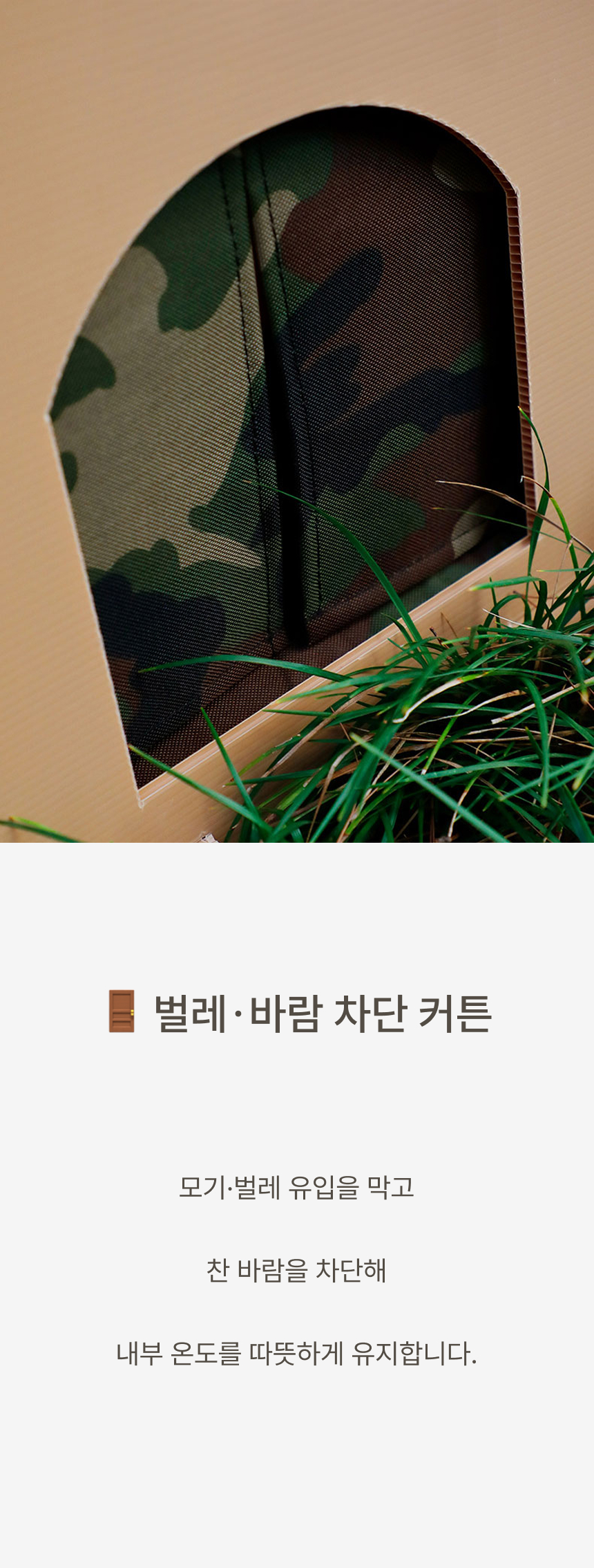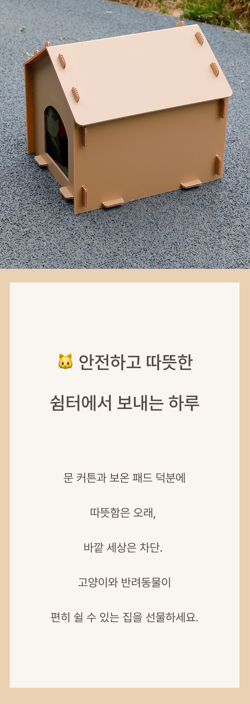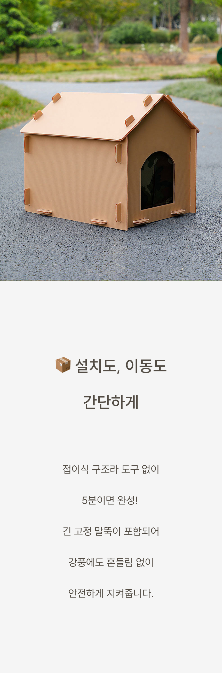 경사 지붕과 높은 바닥 구조로 물 고임, 습기를 차단하고 두꺼운 PP소재와 옥스퍼드 원단으로 긁힘, 마모, 부식까지 방지하는 포근방수 펫하우스입니다.