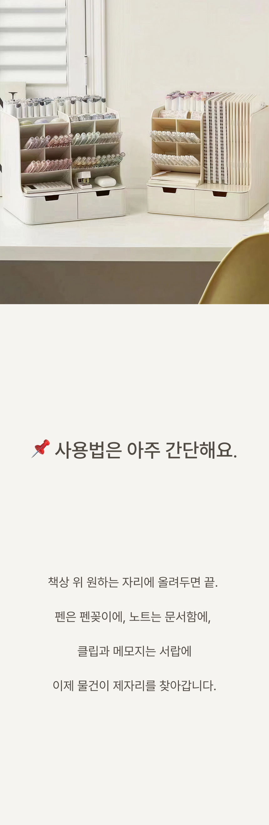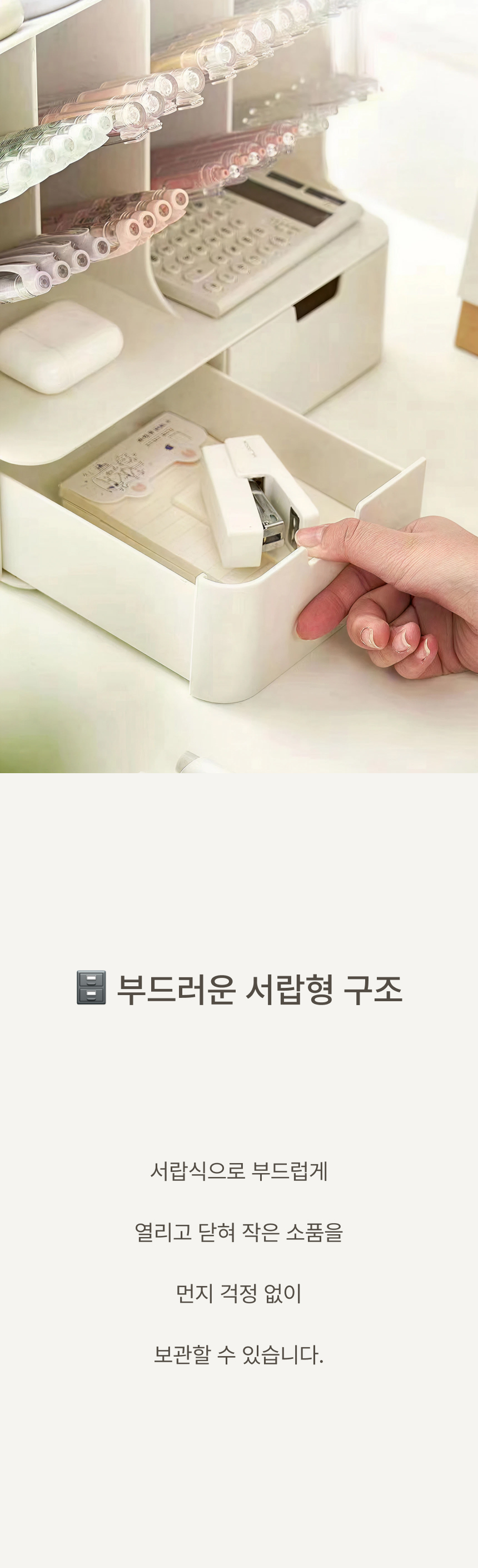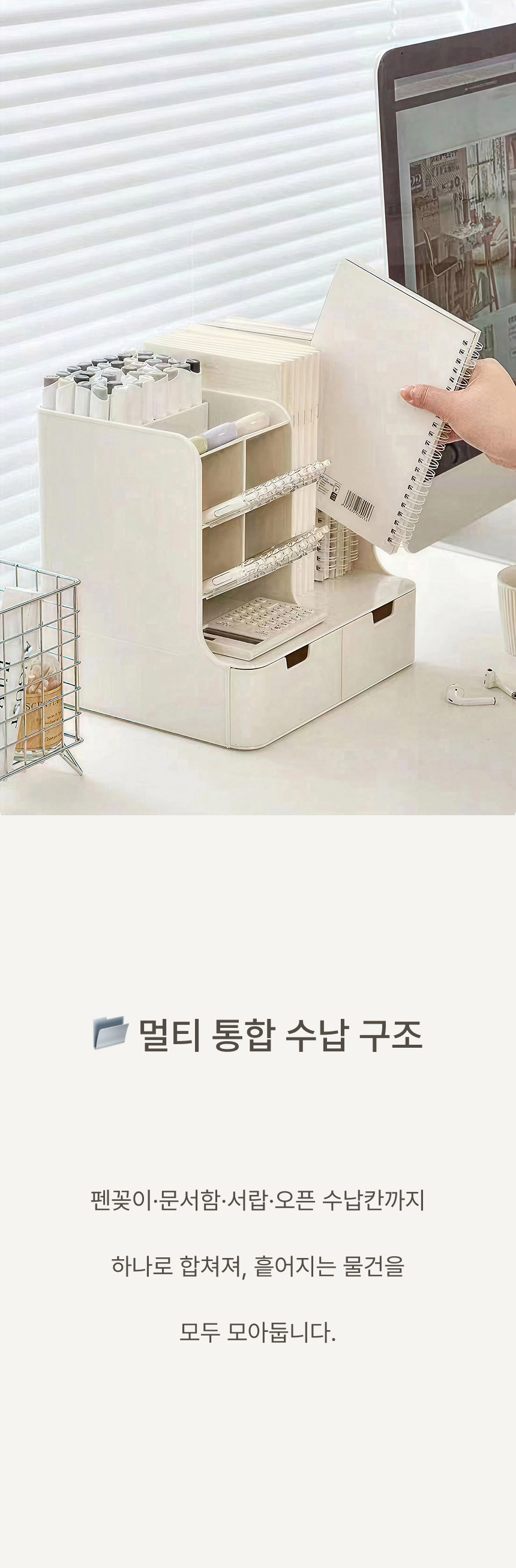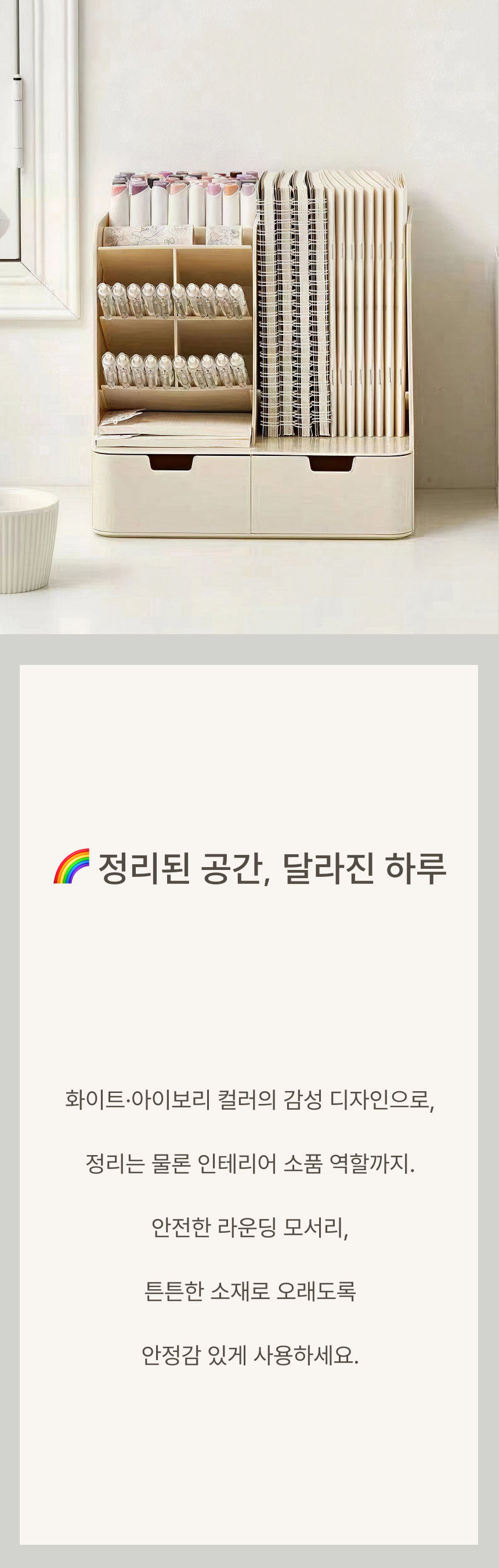 화이트 컬러의 감성 디자인으로 정리는 물론 인테리어 소품 역할까지 안전한 라운딩 모서리에 튼튼한 소재로 오래도록 안정감 있게 사용할 수 있는 데스크정리함입니다.