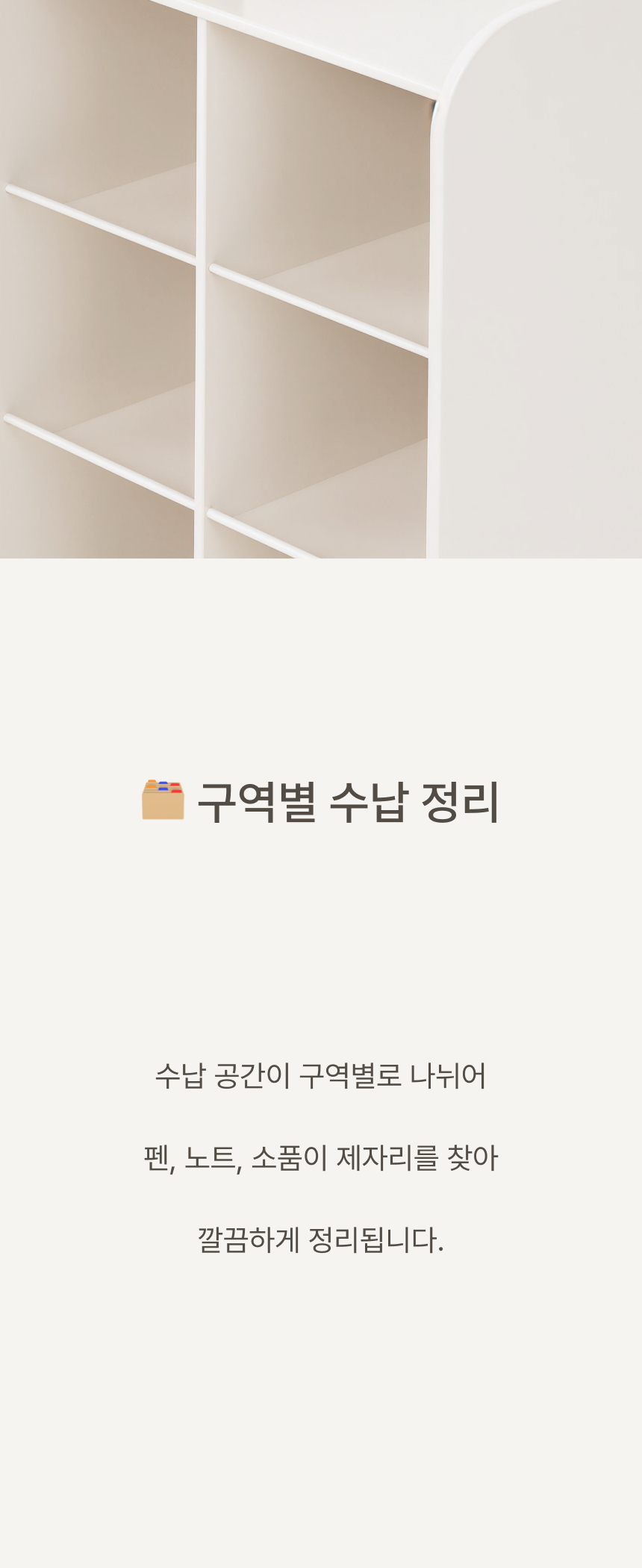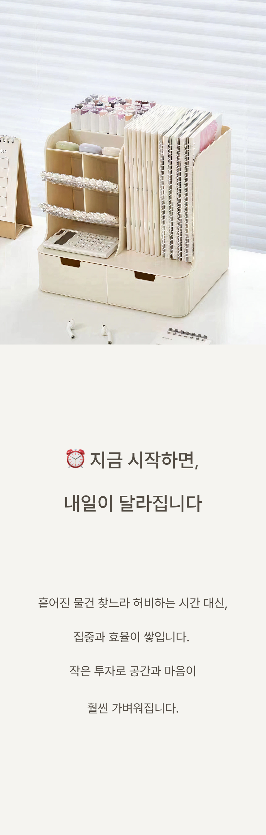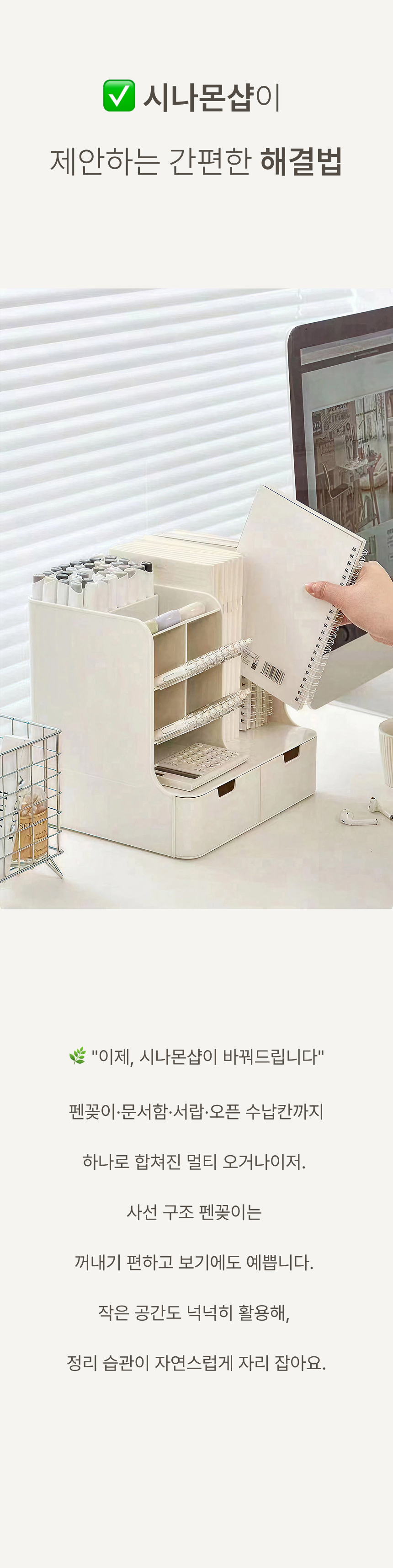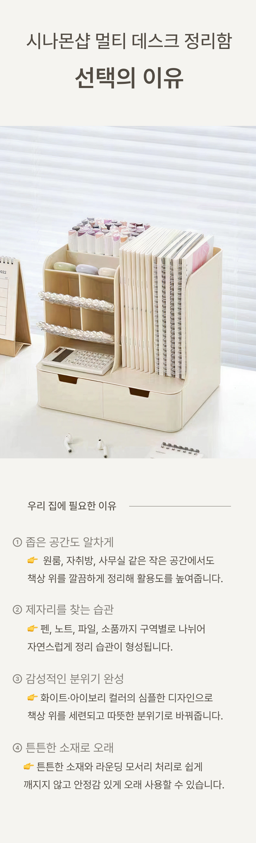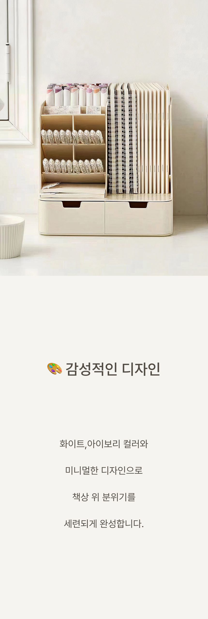 화이트 컬러의 감성 디자인으로 정리는 물론 인테리어 소품 역할까지 안전한 라운딩 모서리에 튼튼한 소재로 오래도록 안정감 있게 사용할 수 있는 데스크정리함입니다.