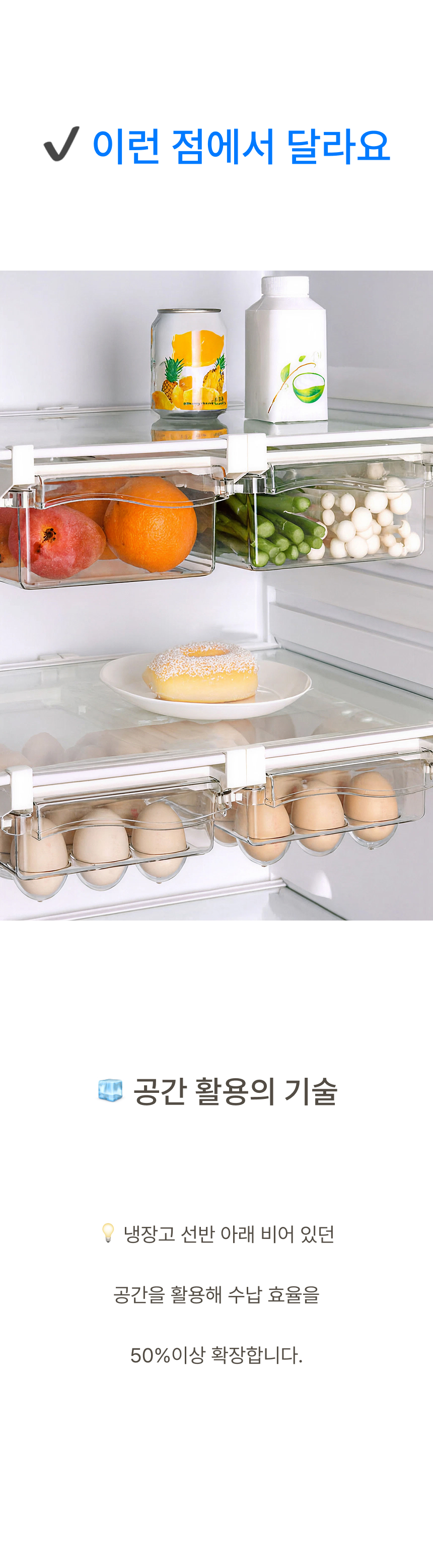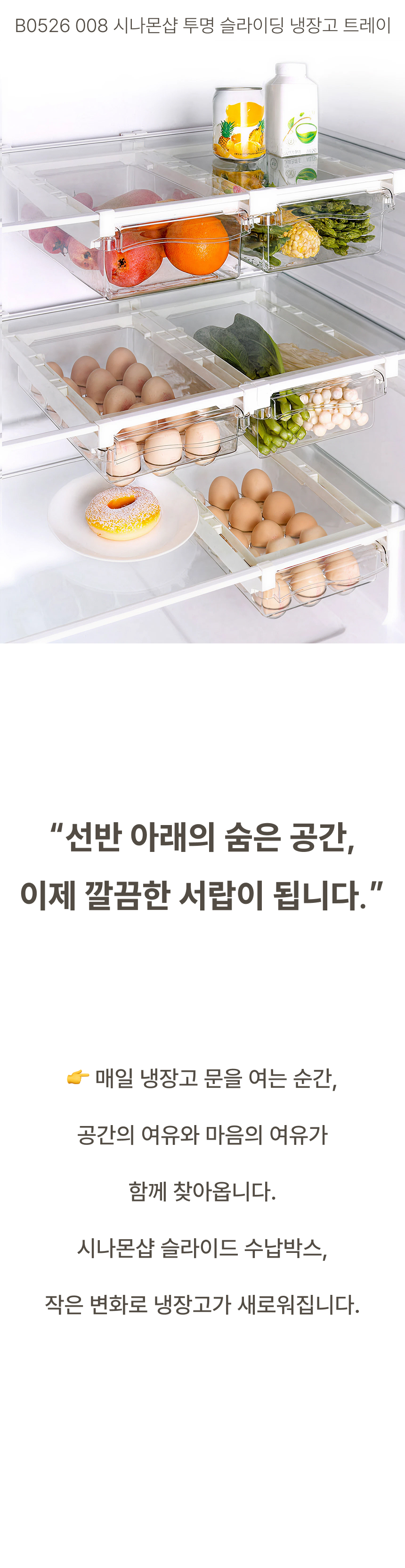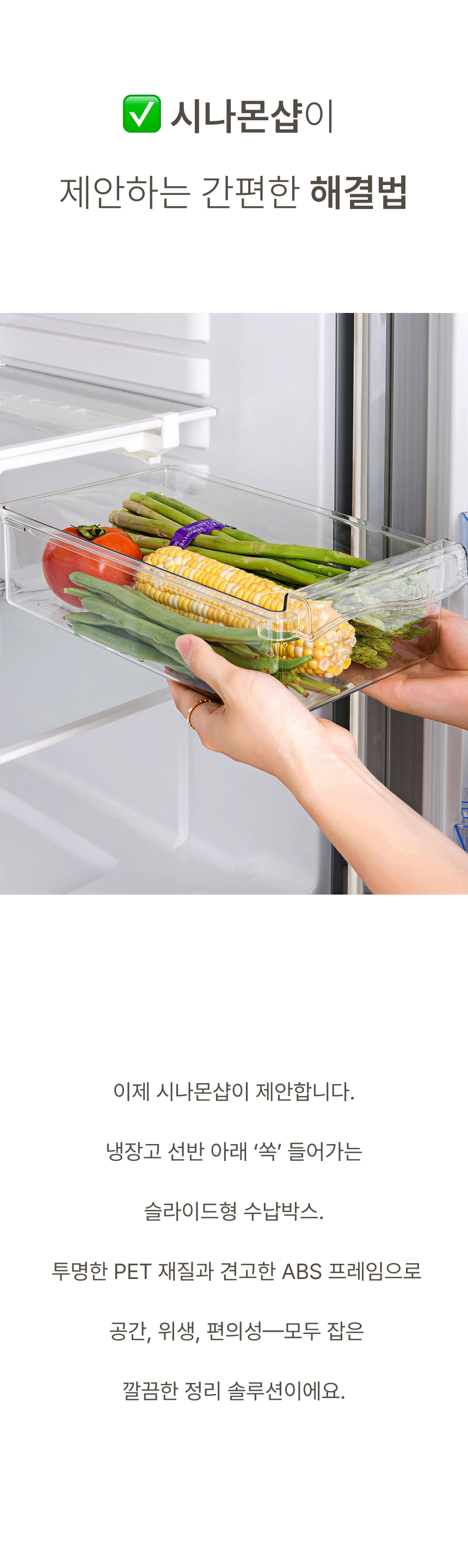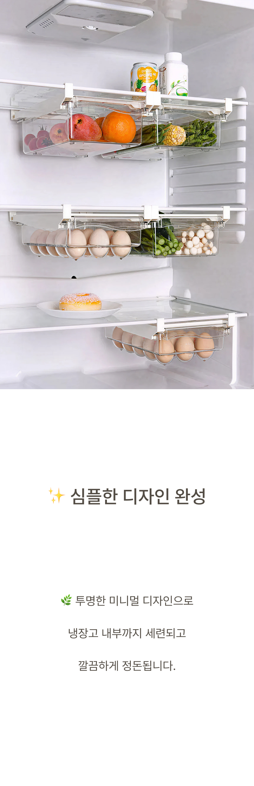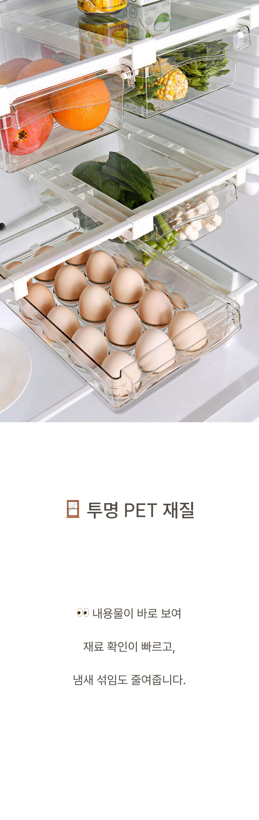 냉장고 선반 아래 쏙 들어가는 슬라이드형 수납박스. 투명한 PET 재질과 견고한 ABS 프레임으로 공간, 위생, 편의성을 모두 잡았어요.
