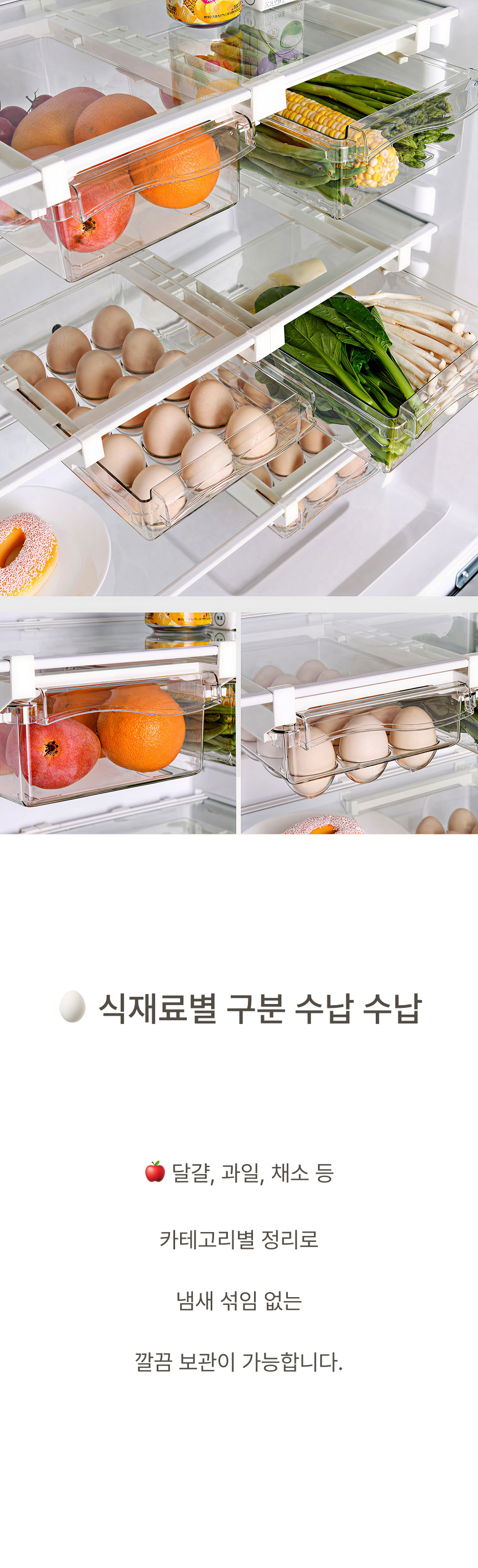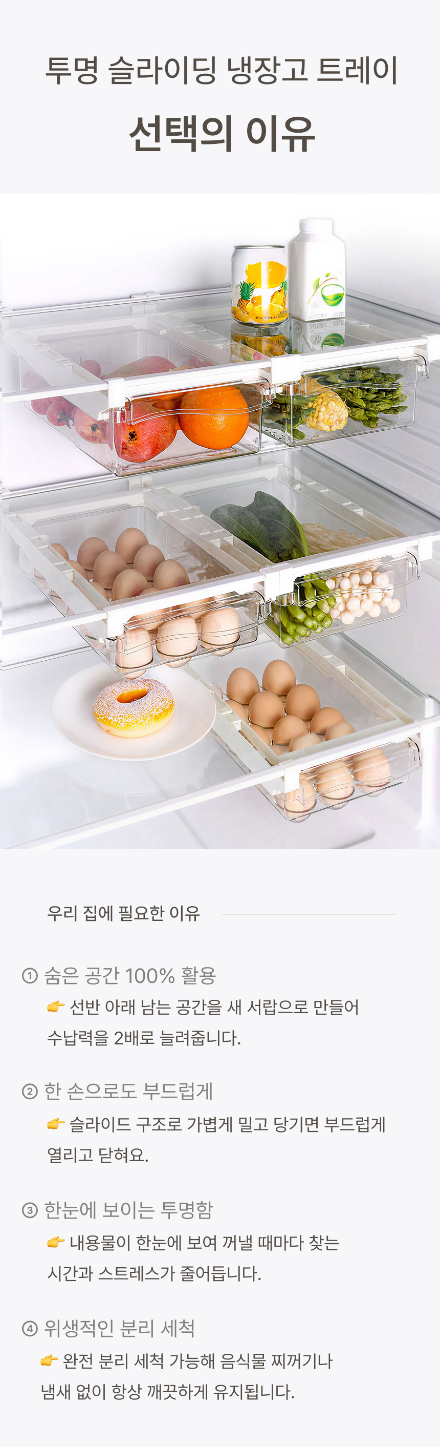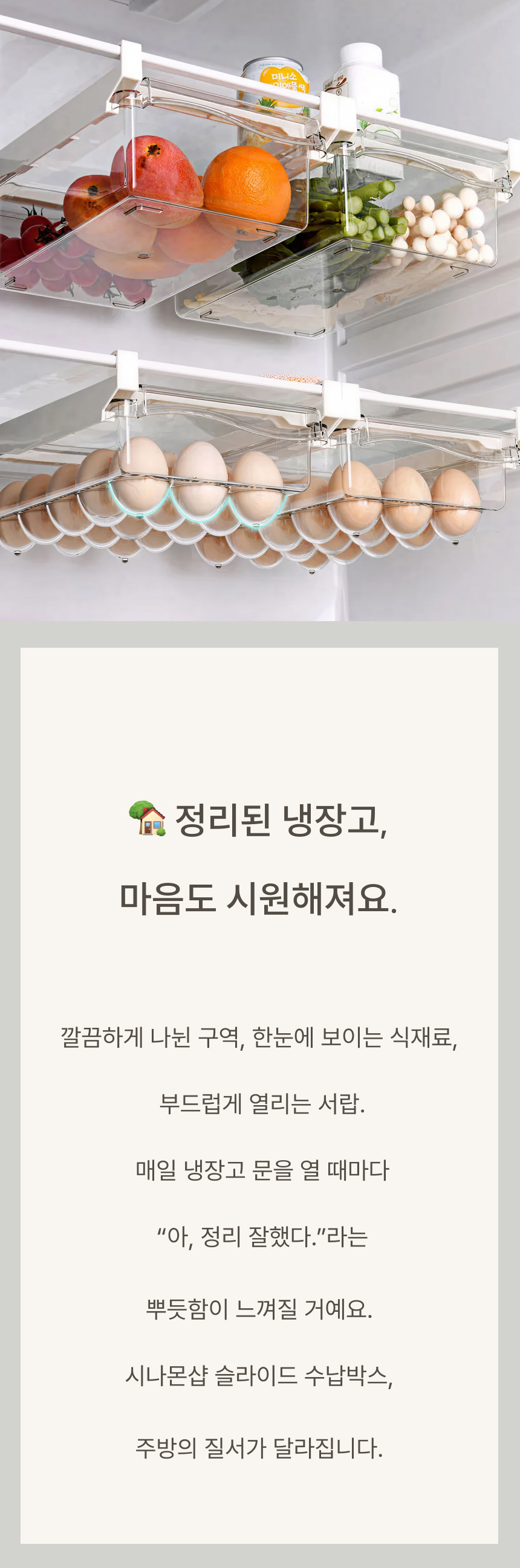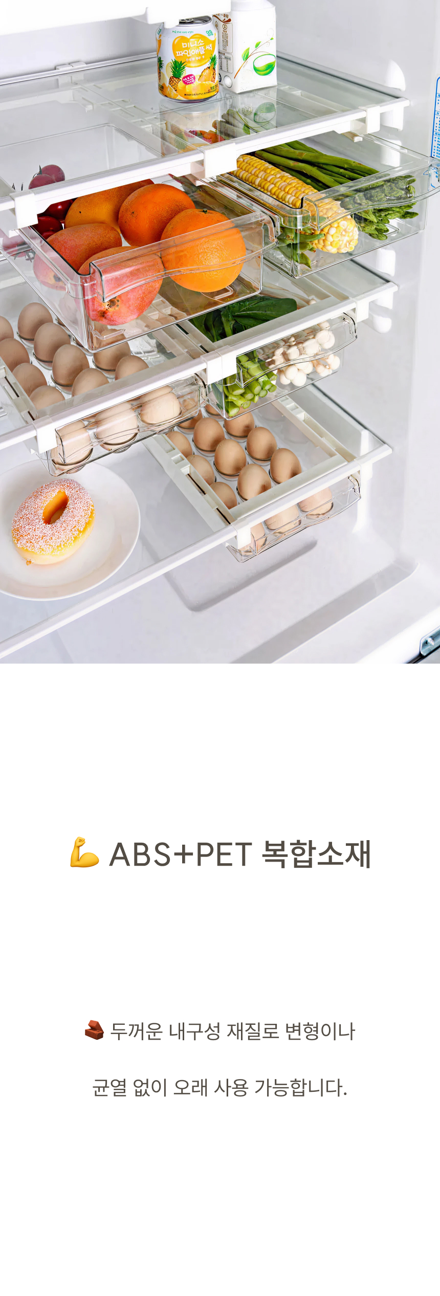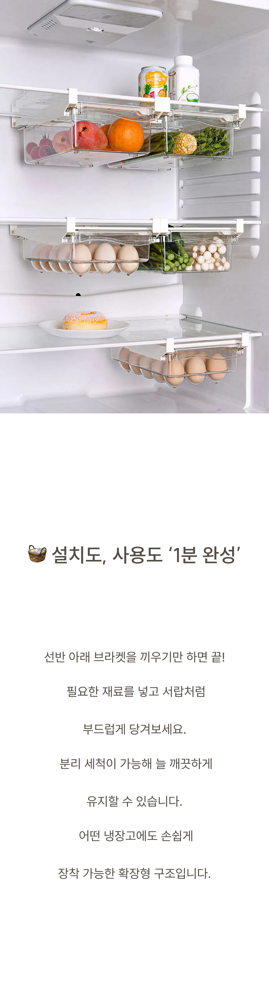 냉장고 선반 아래 쏙 들어가는 슬라이드형 수납박스. 투명한 PET 재질과 견고한 ABS 프레임으로 공간, 위생, 편의성을 모두 잡았어요.