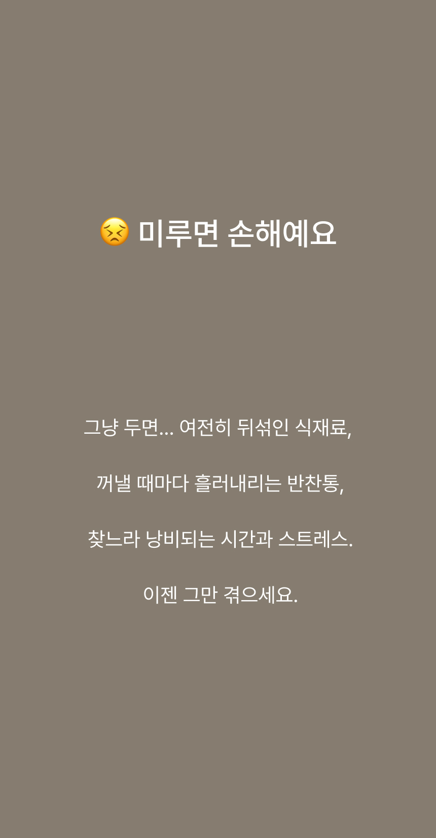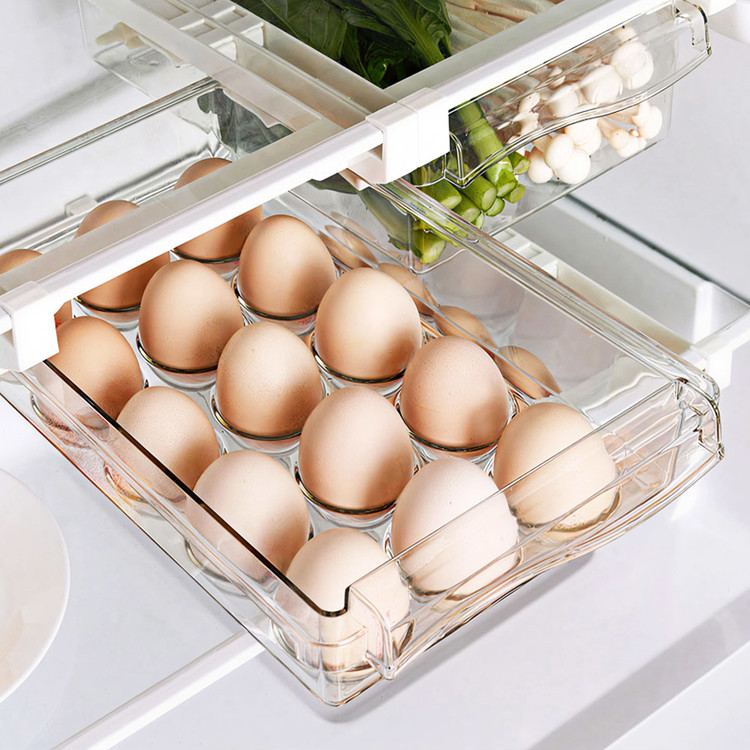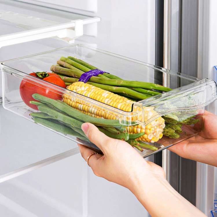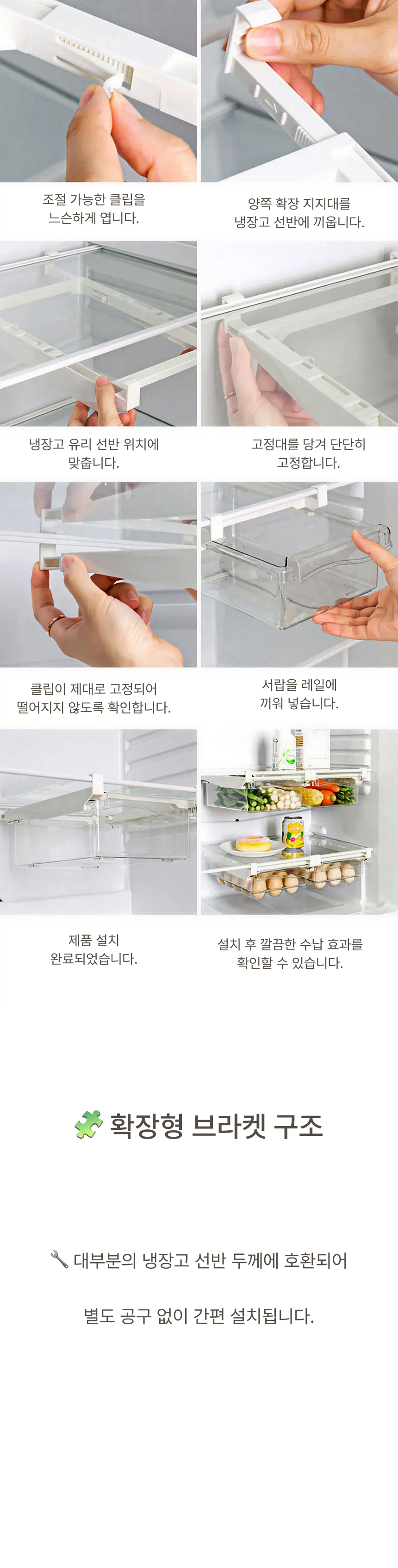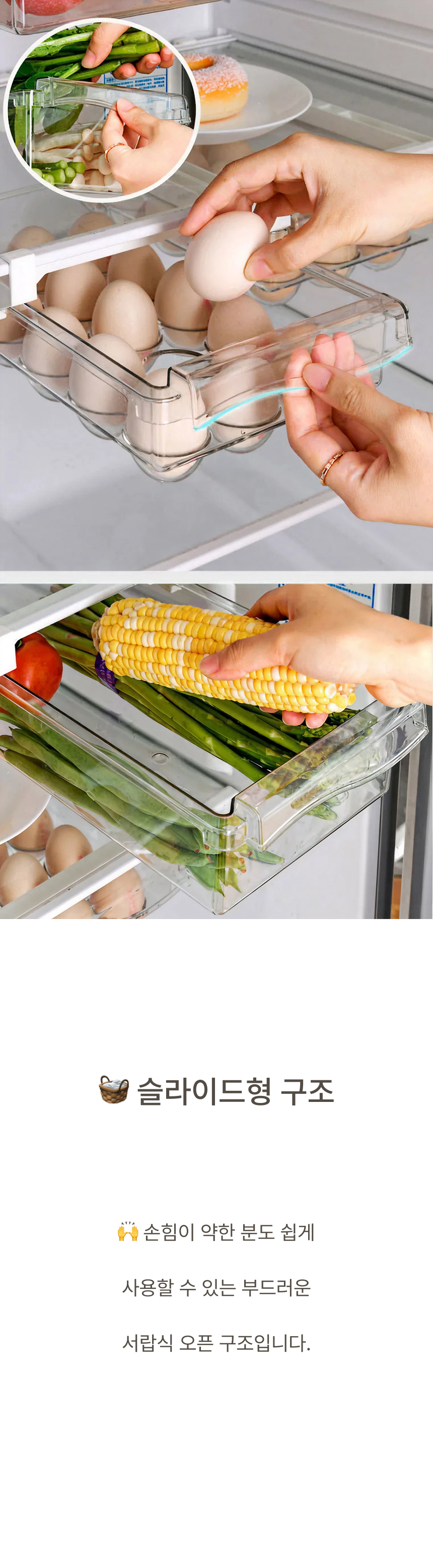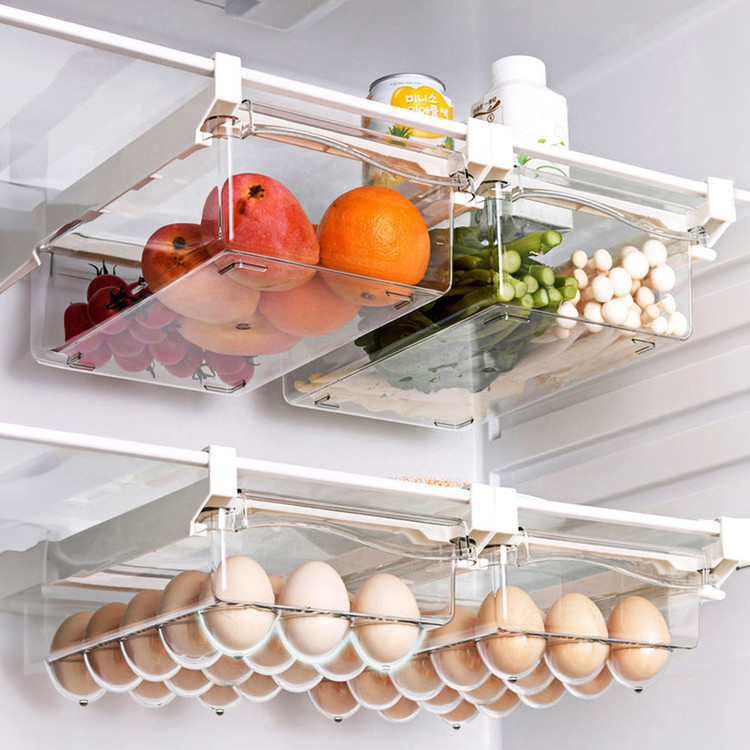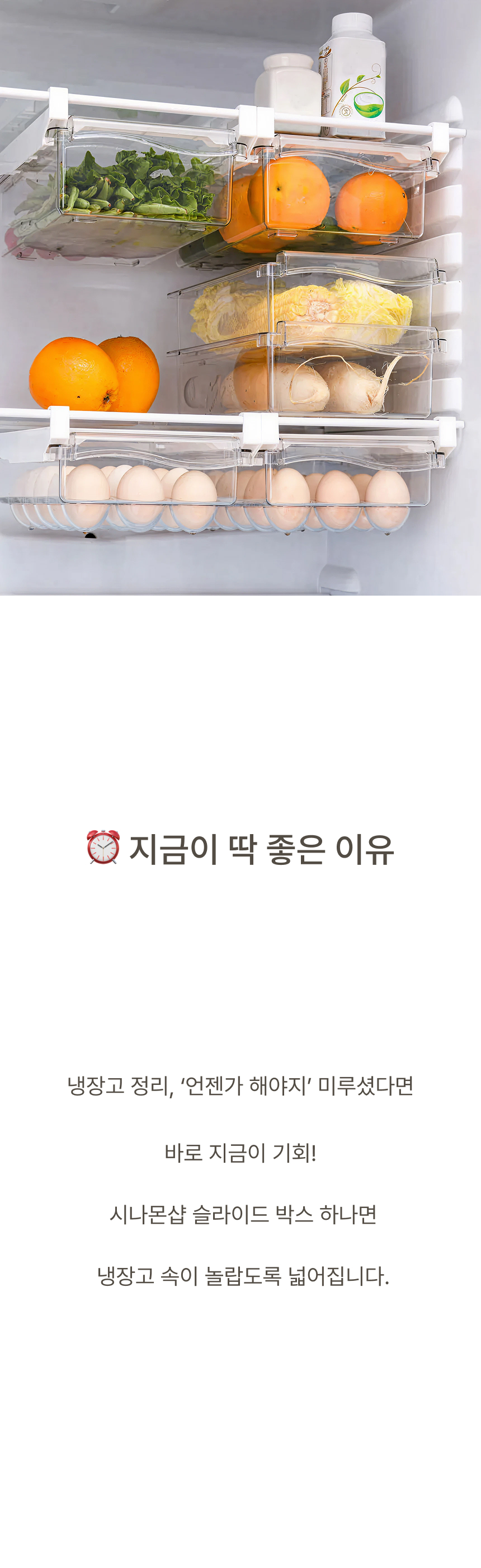냉장고 선반 아래 쏙 들어가는 슬라이드형 수납박스. 투명한 PET 재질과 견고한 ABS 프레임으로 공간, 위생, 편의성을 모두 잡았어요.