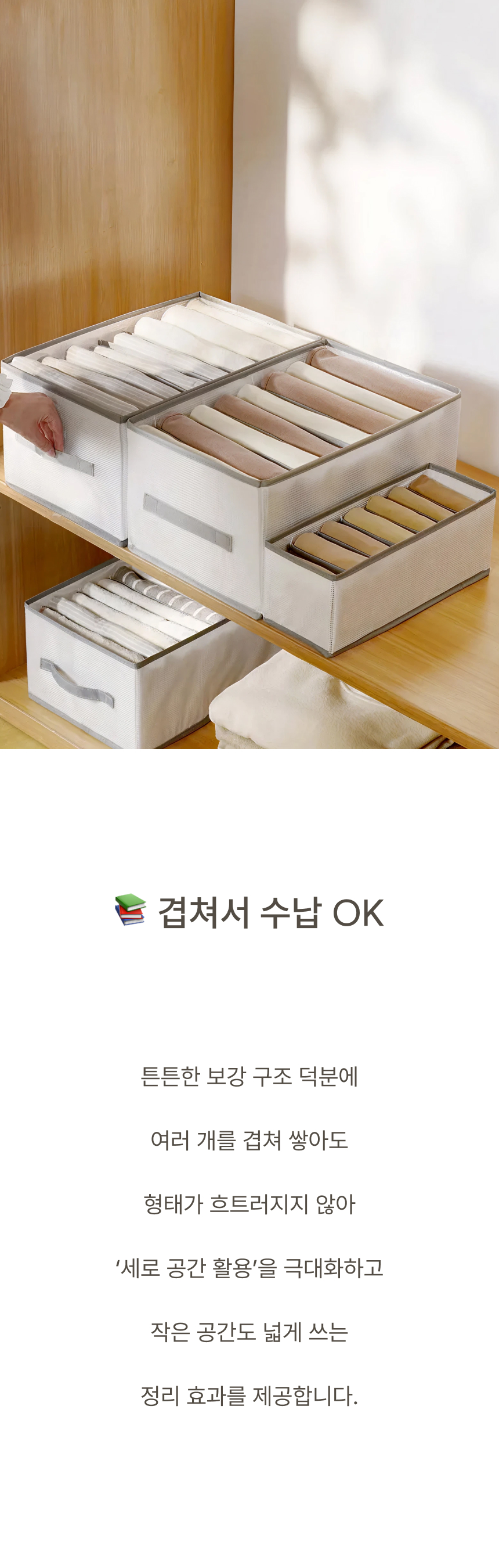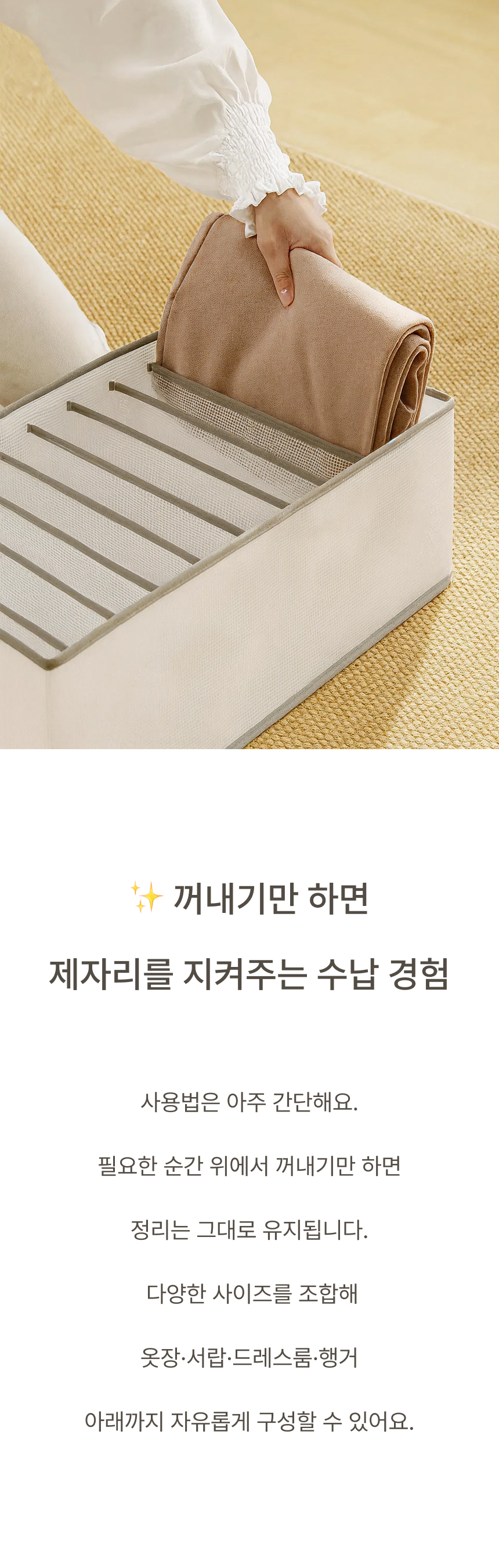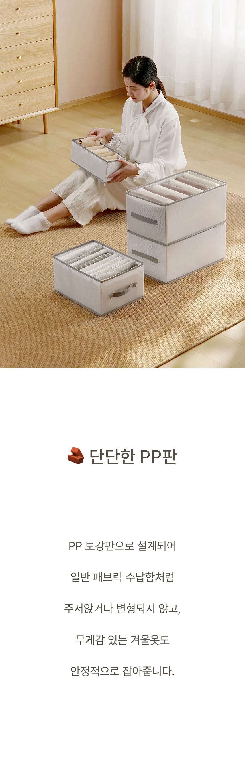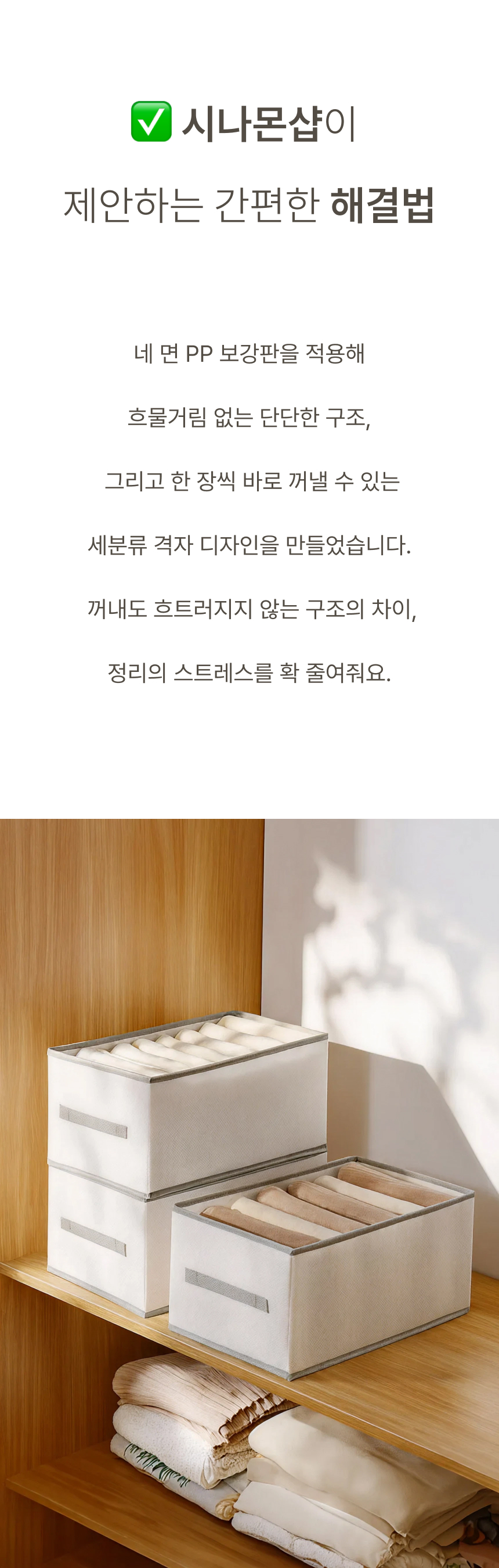 네 면 PP 보강판을 적용해 흐물거림 없는 단단한 구조 그리고 한 장씩 꺼낼 수 있는 세분류 격자 디자인으로 만들었습니다.