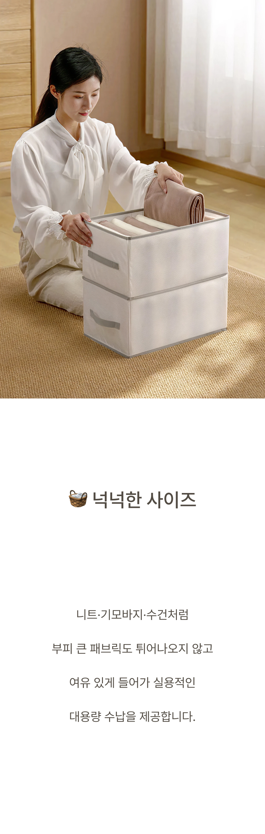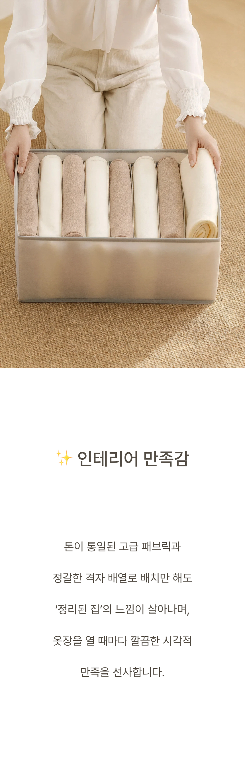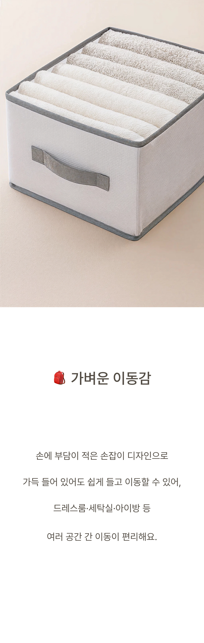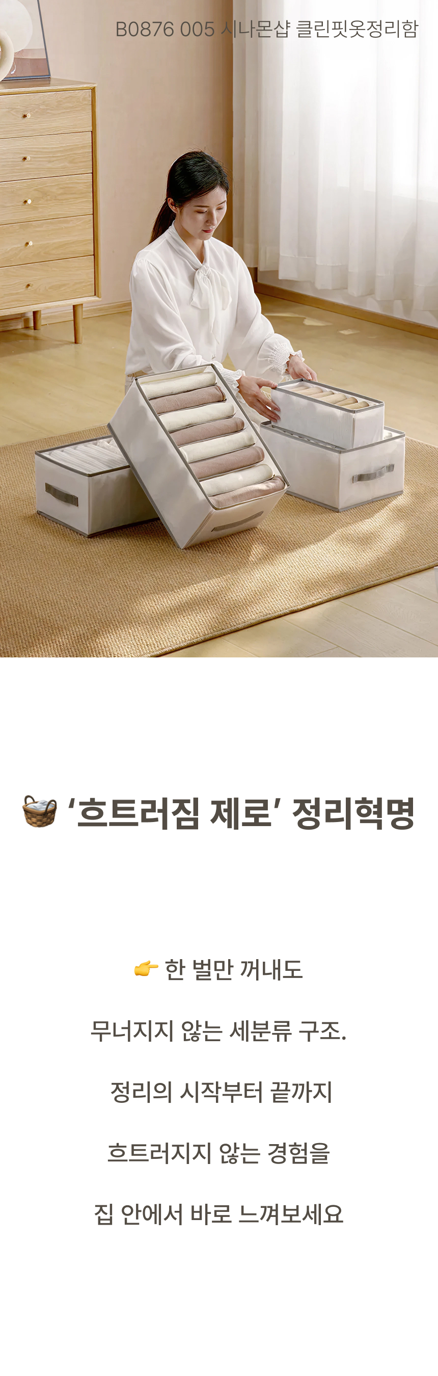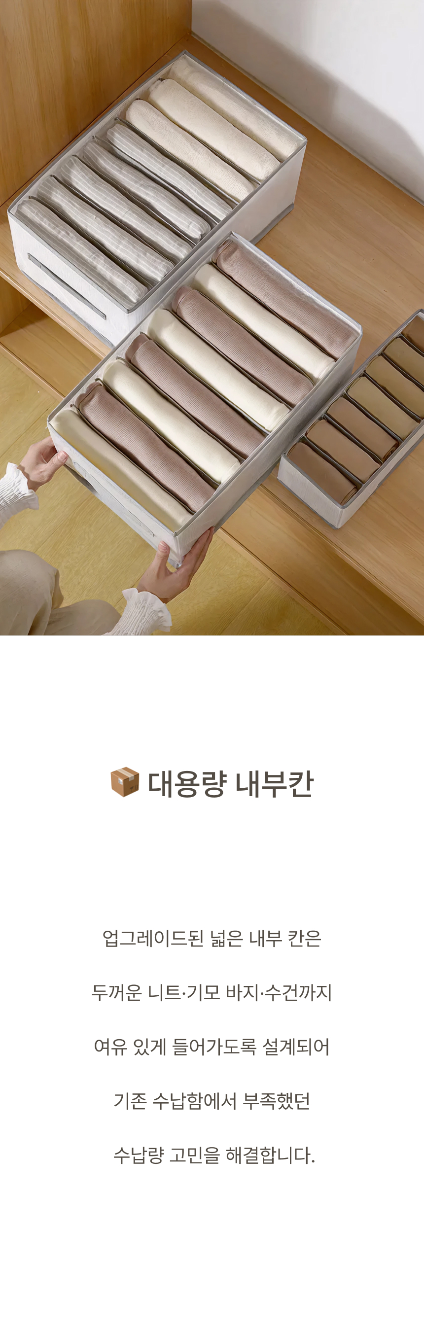 네 면 PP 보강판을 적용해 흐물거림 없는 단단한 구조 그리고 한 장씩 꺼낼 수 있는 세분류 격자 디자인으로 만들었습니다.