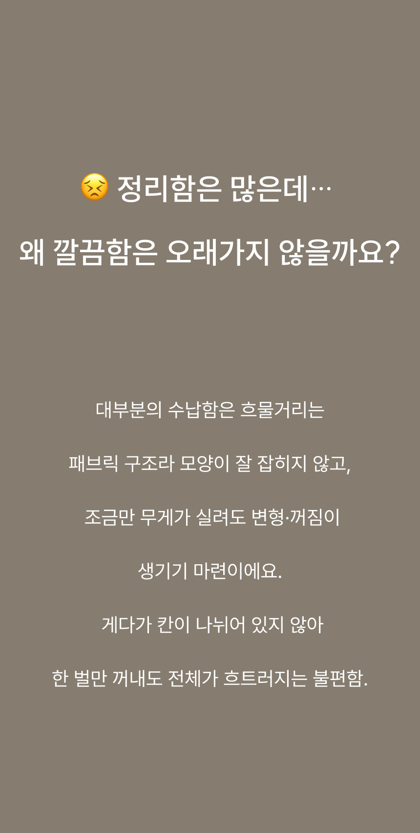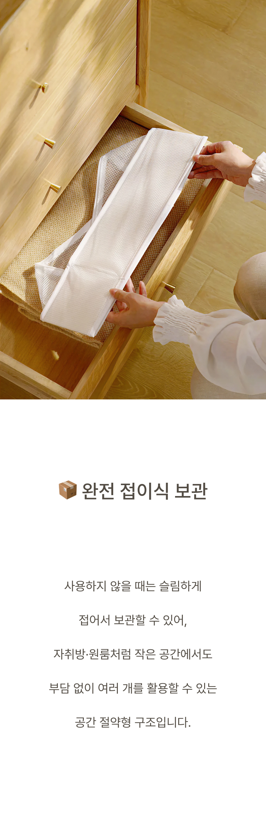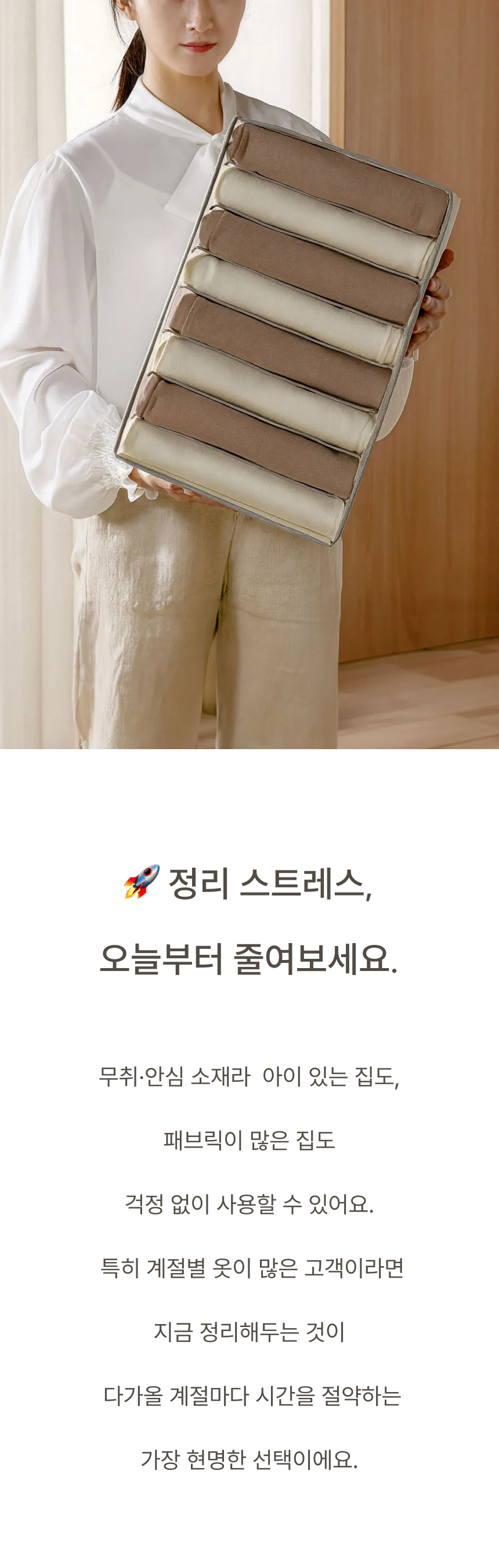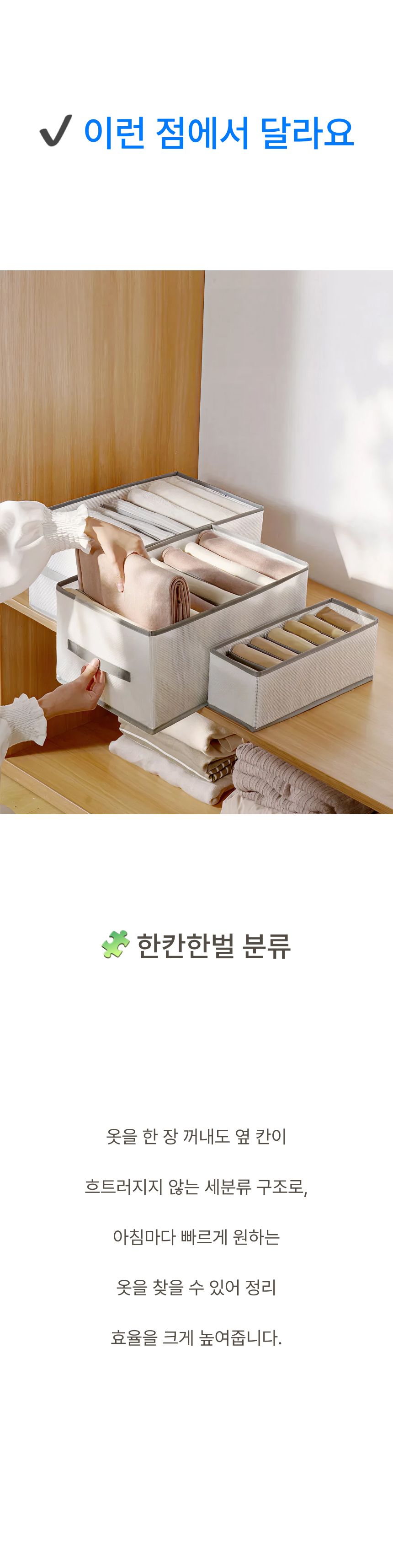 네 면 PP 보강판을 적용해 흐물거림 없는 단단한 구조 그리고 한 장씩 꺼낼 수 있는 세분류 격자 디자인으로 만들었습니다.