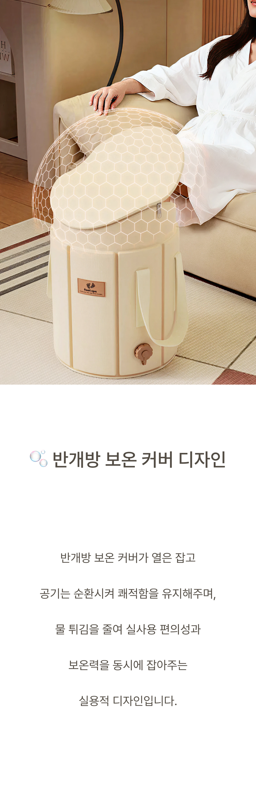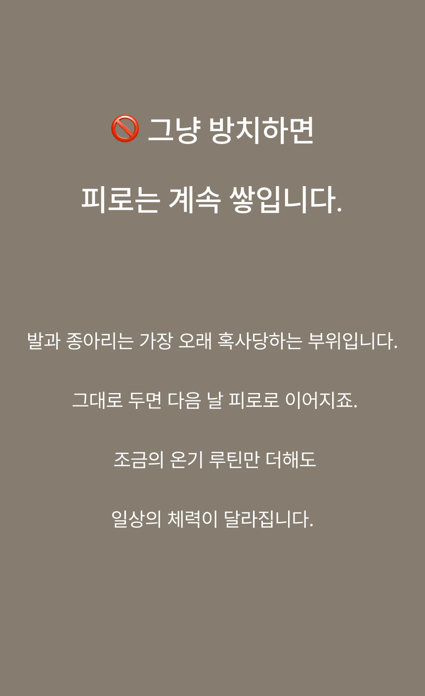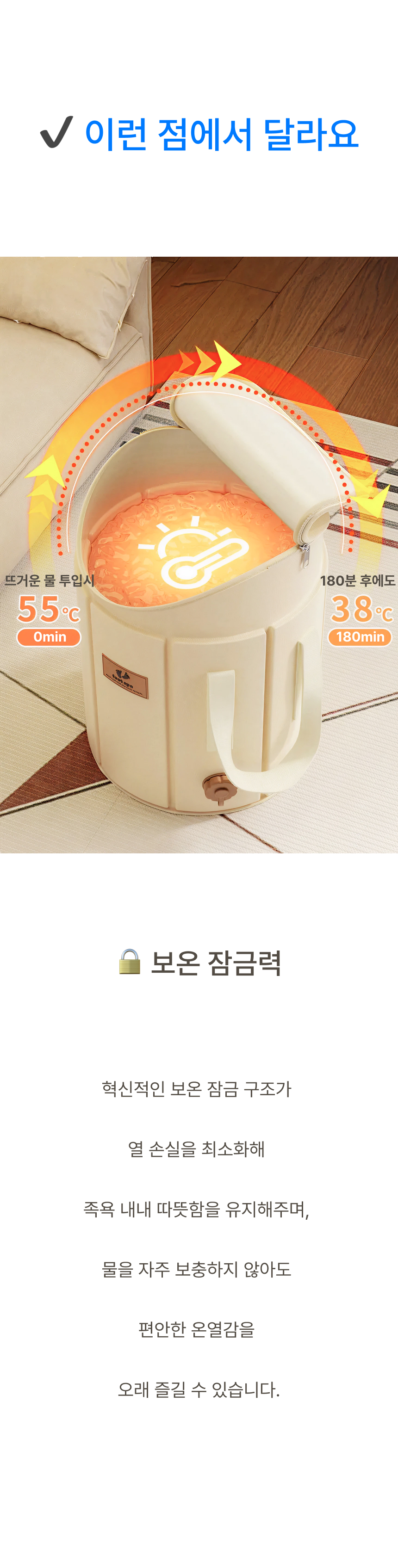 발부터 종아리까지 깊숙하게 잠기는 5중 보온층 + 뚜껑 설계로 온기를 180분까지 유지합니다.