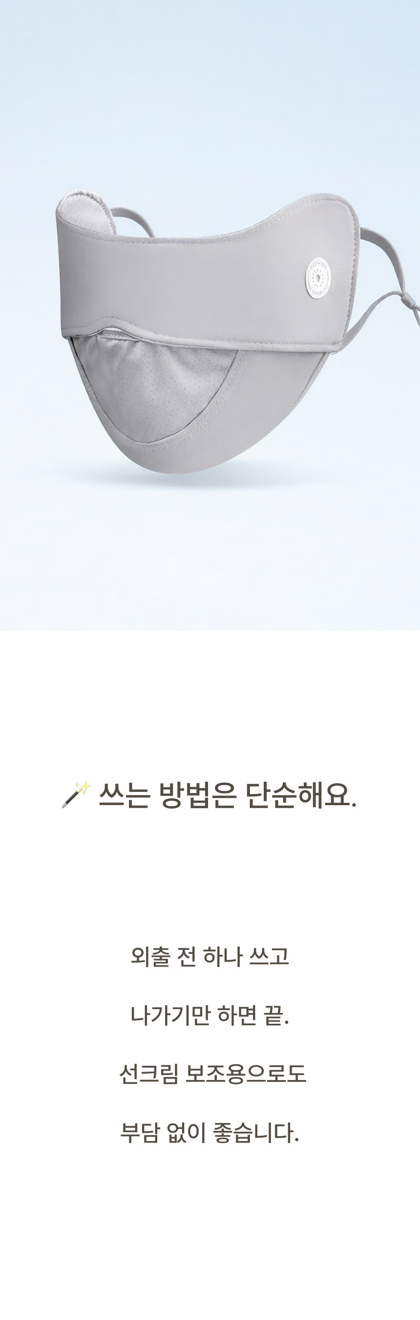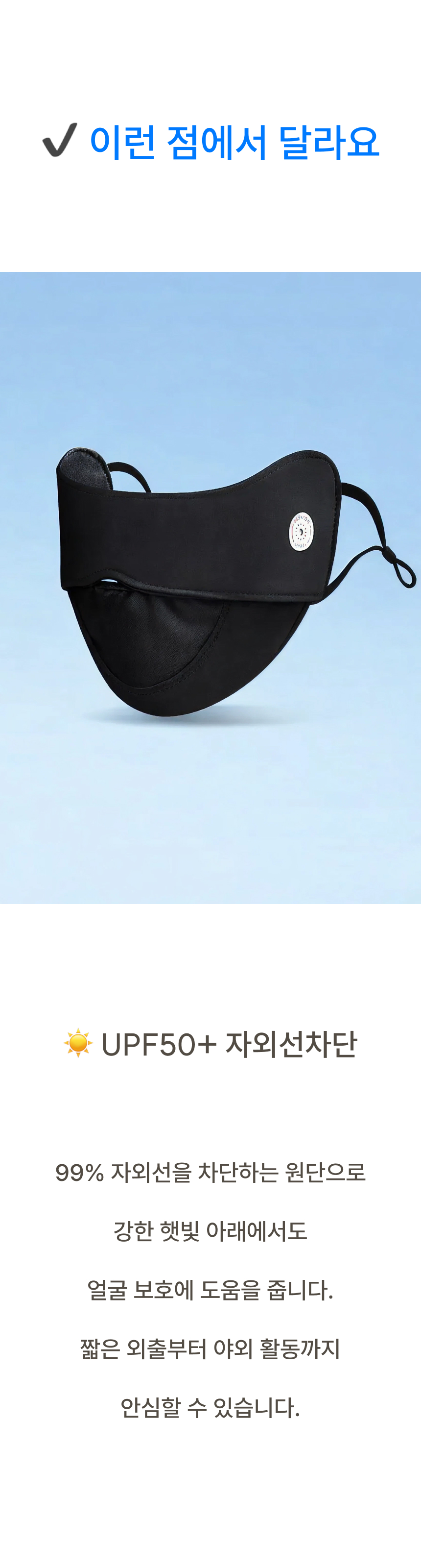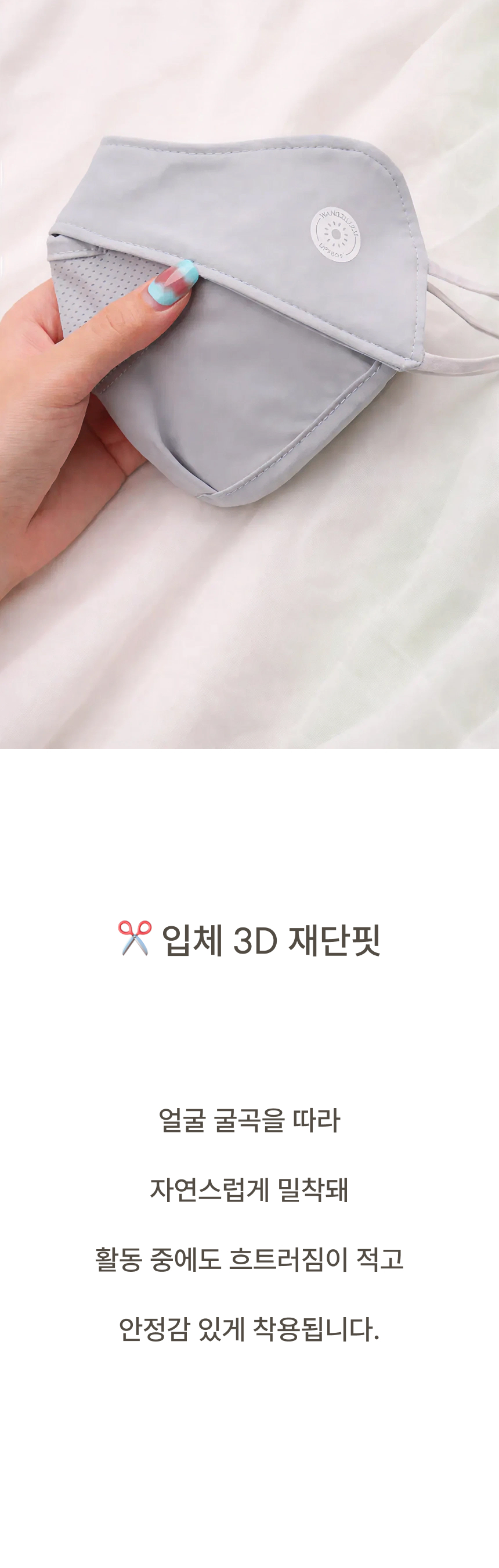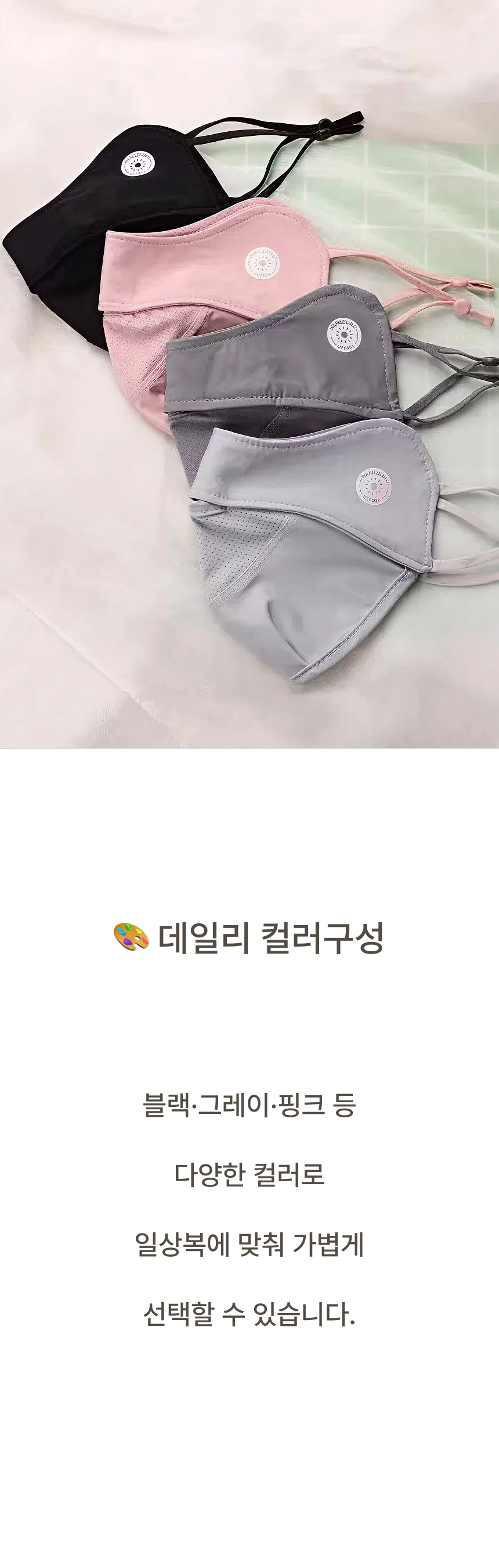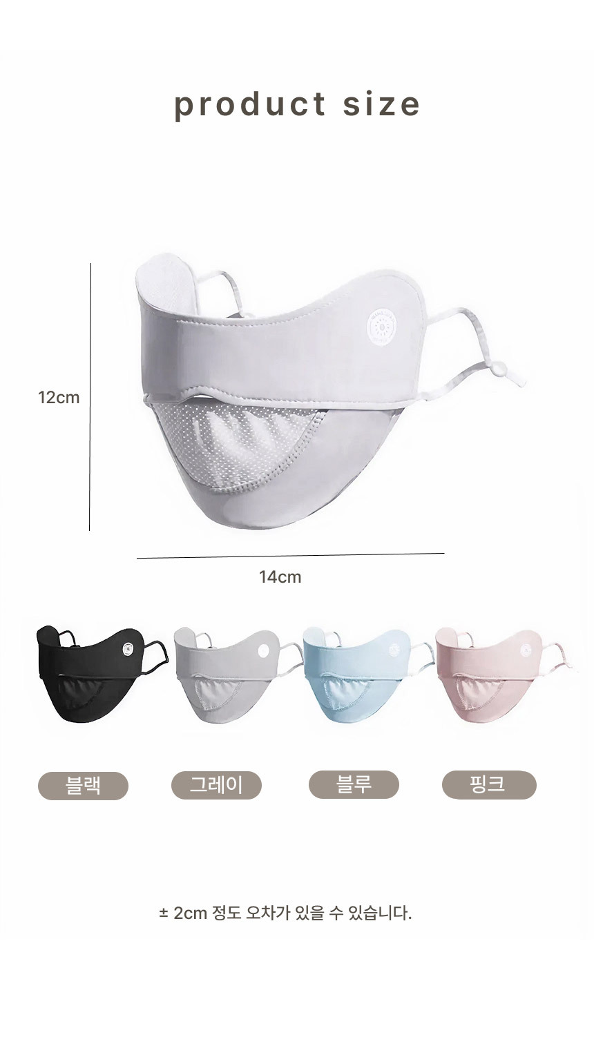 자외선 차단 원단으로 햇빛 아래에서도 얼굴 보호에 도움을 주는 자외선차단 마스크입니다.