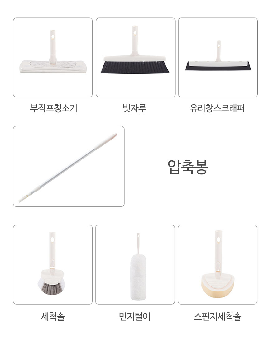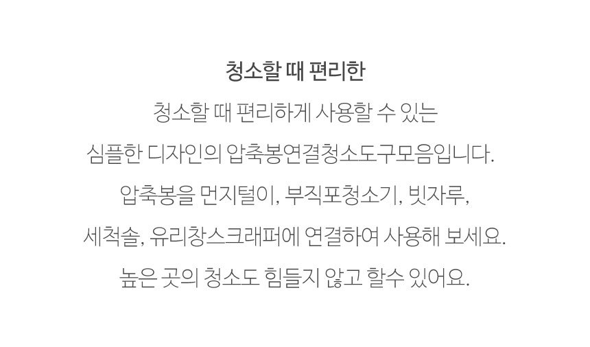 청소할 때 편리한 청소할 때 편리하게 사용할 수 있는 심플한 디자인의 압축봉 연결 청소도구모음입니다. 압축봉을 먼지털이, 부직포청소기, 빗자루, 세척솔, 유리창스크래퍼에 연결하여 사용해 보세요. 높은 곳의 청소도 힘들지 않고 할 수 있어요.