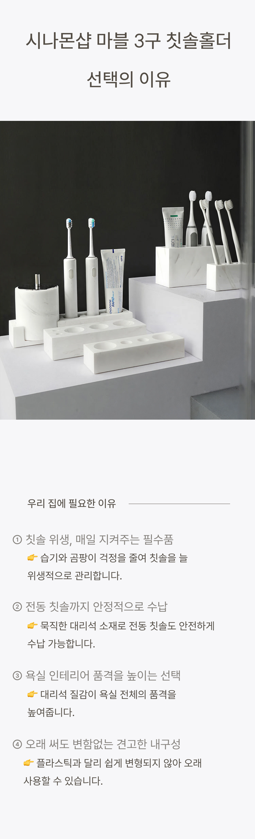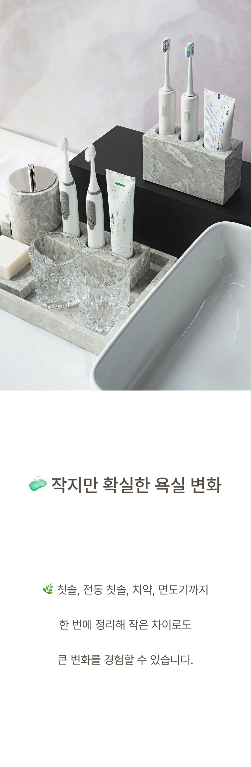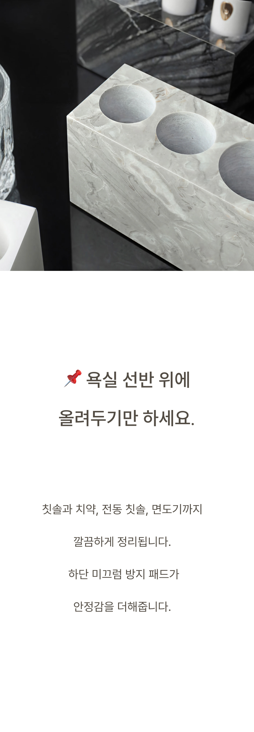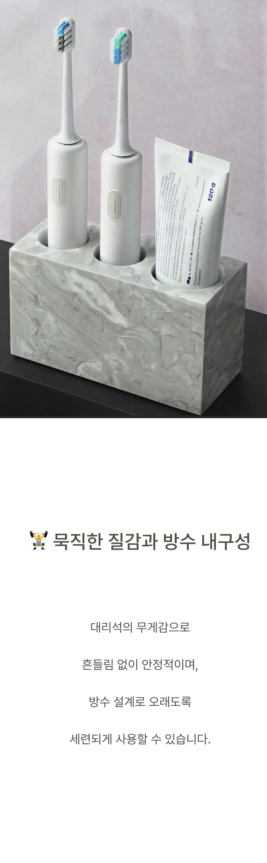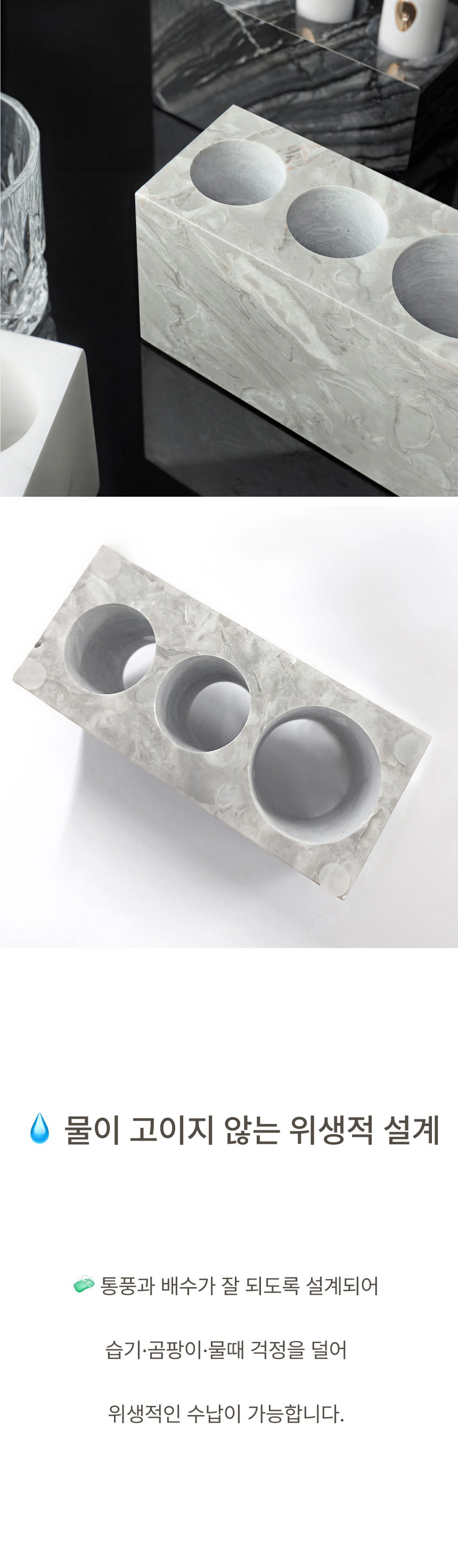고급스러운 대리석 질감으로 욕실 분위기를 호텔처럼 바꾸고 플라스틱이 아닌 묵직한 대리석으로 흔들림 없이 안정적으로 보관이 가능한 마블 3구 칫솔홀더입니다.