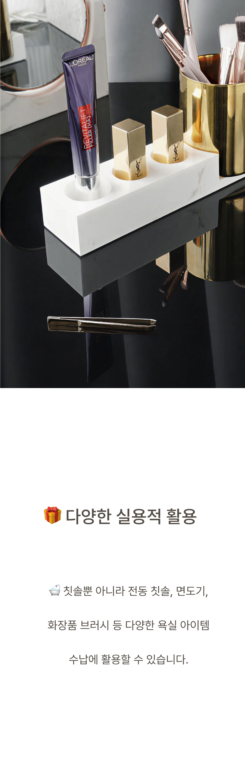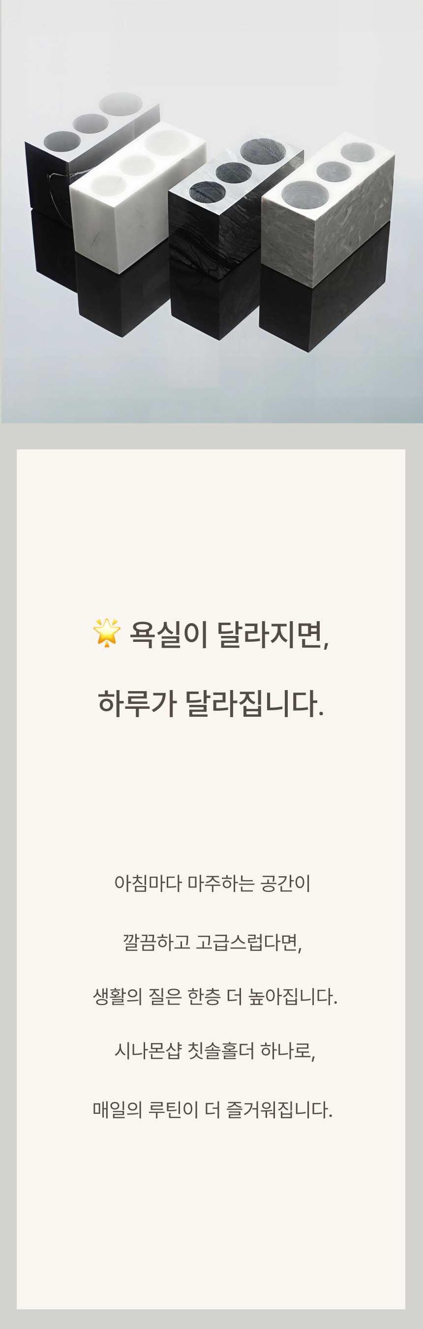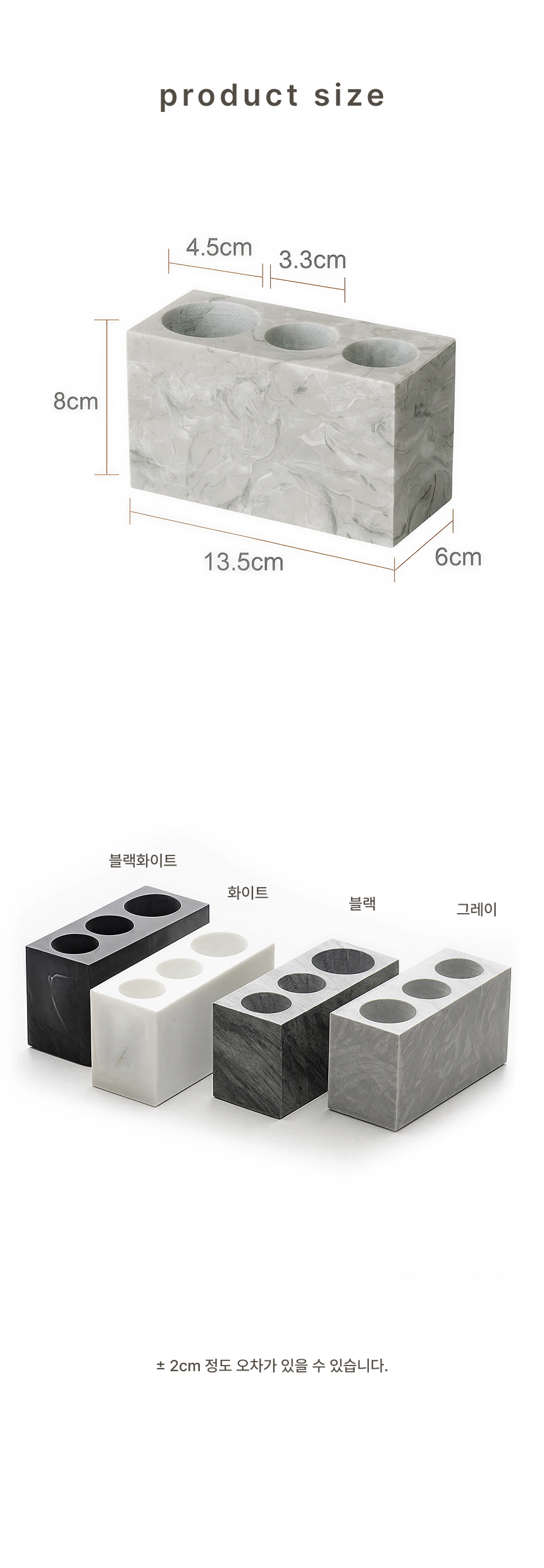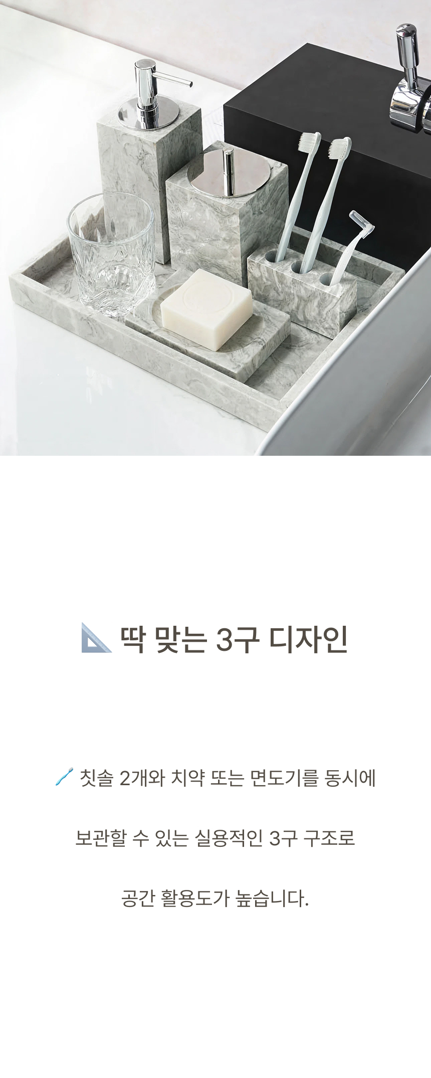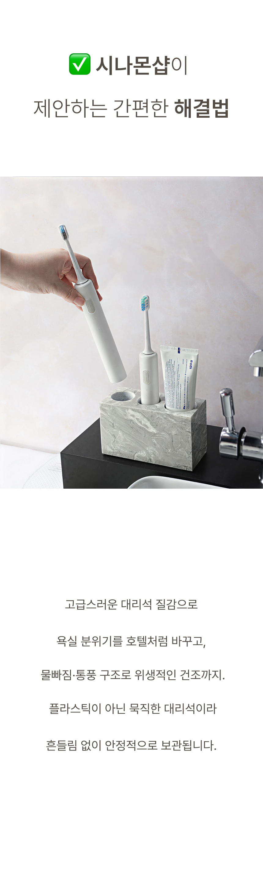 고급스러운 대리석 질감으로 욕실 분위기를 호텔처럼 바꾸고 플라스틱이 아닌 묵직한 대리석으로 흔들림 없이 안정적으로 보관이 가능한 마블 3구 칫솔홀더입니다.