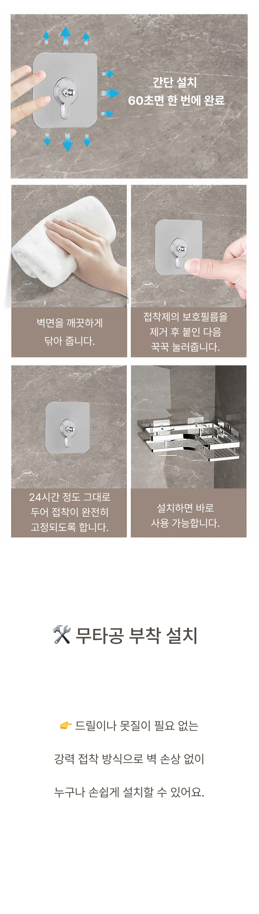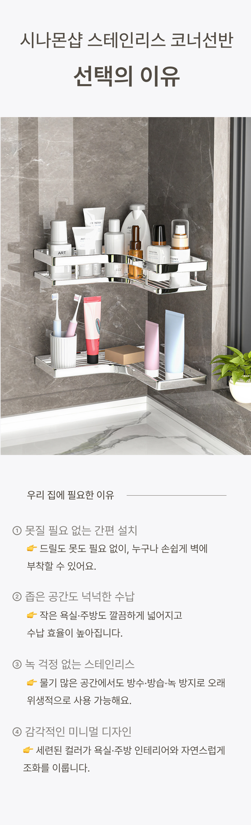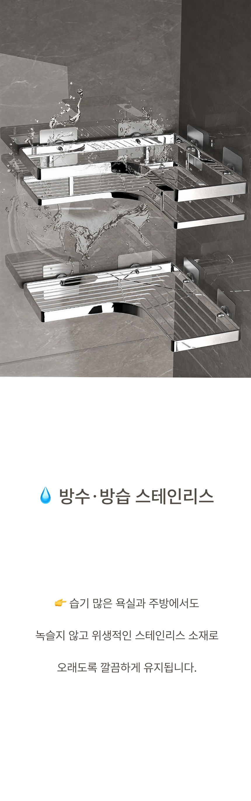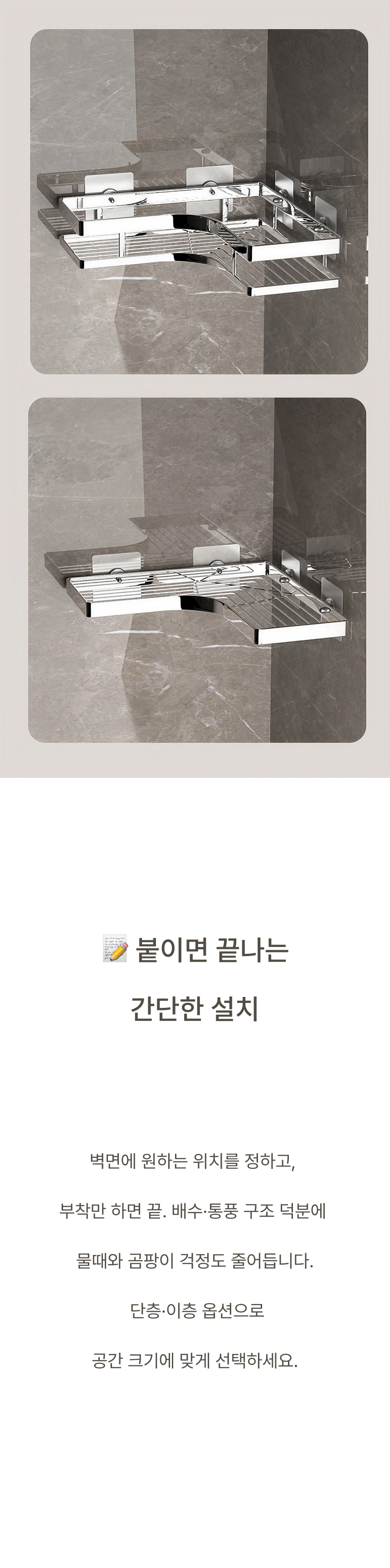접착 스티커를 부착하는 방식으로 누구나 간편하게 설치할 수 있고 녹이 잘 슬지 않는 스테인리스 소재로 욕실, 주방 등 어디에서나 오랫동안 위생적으로 사용 가능한 스테인리스 코너선반입니다.
