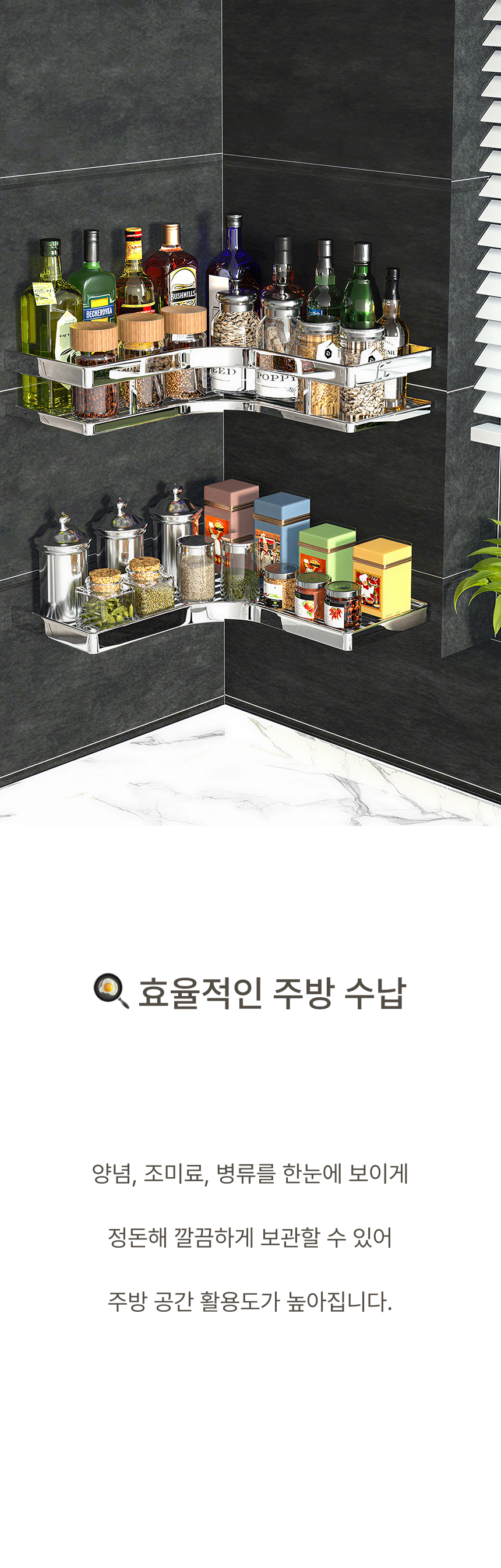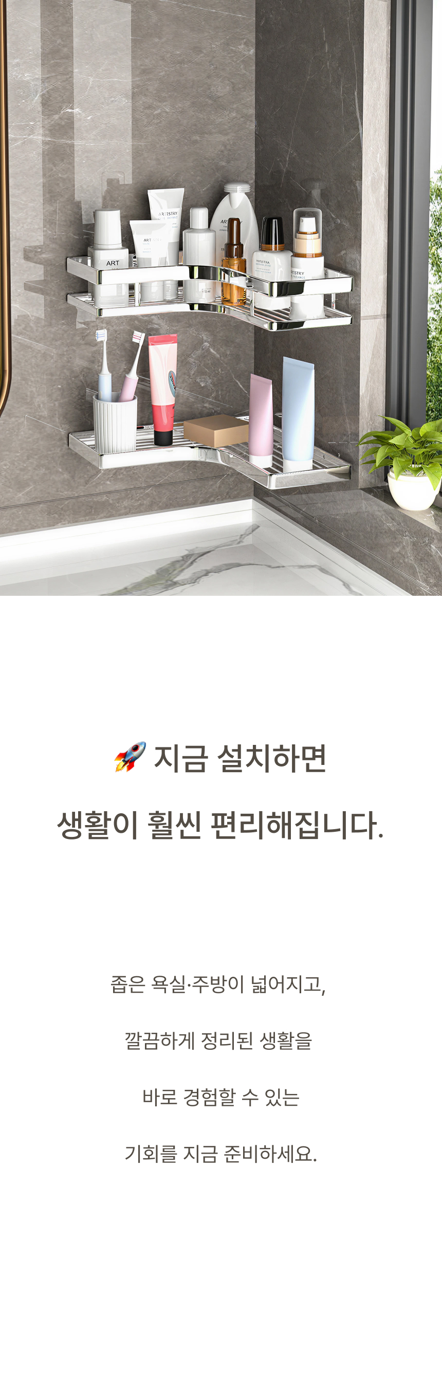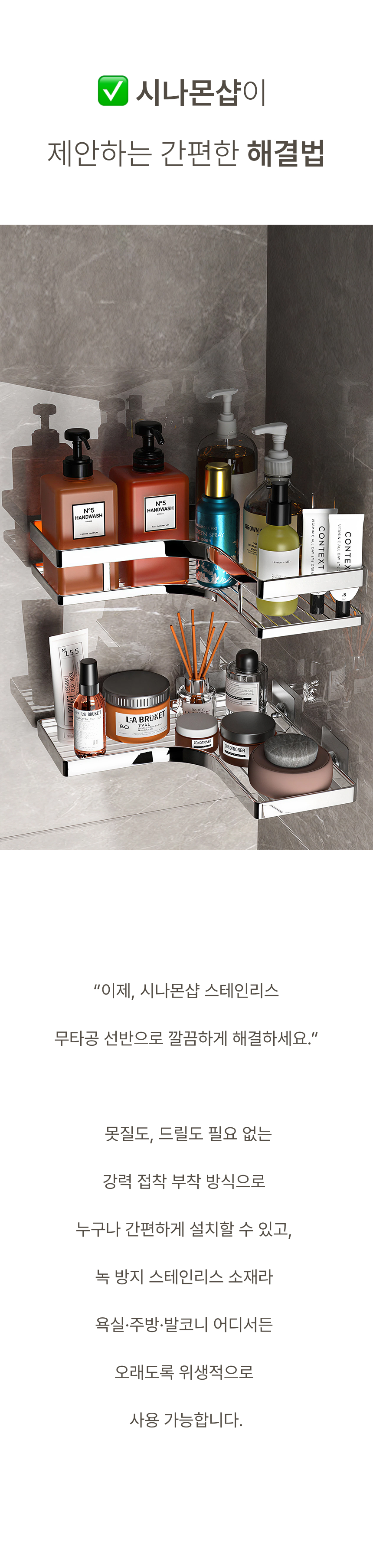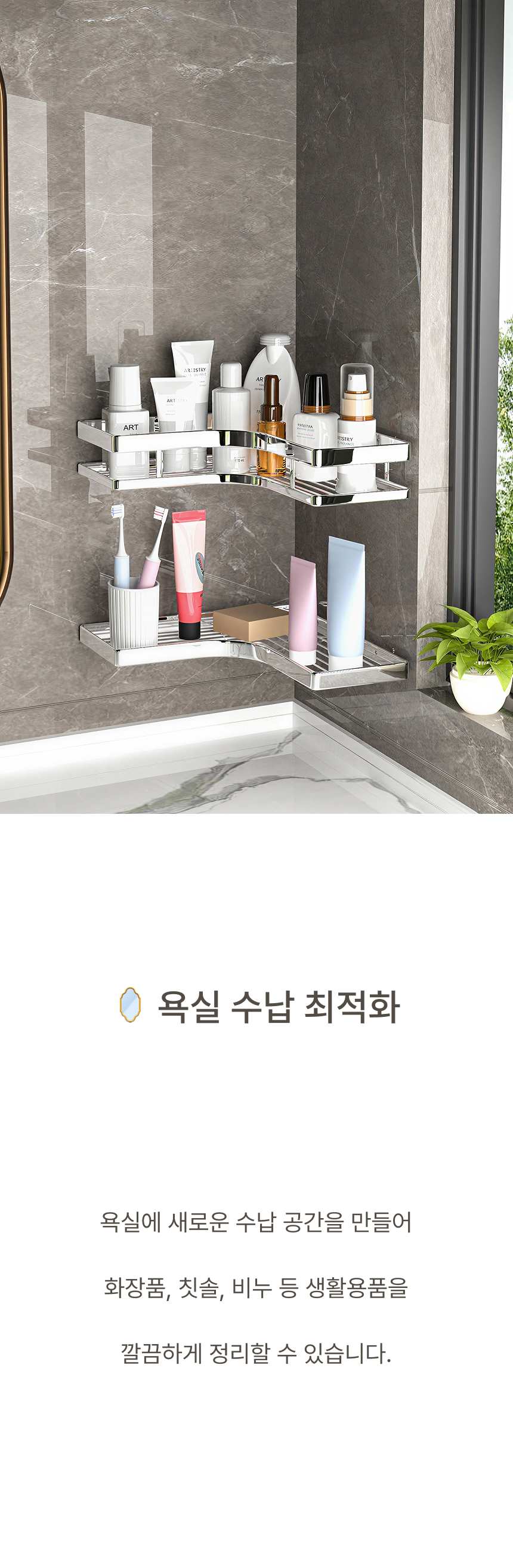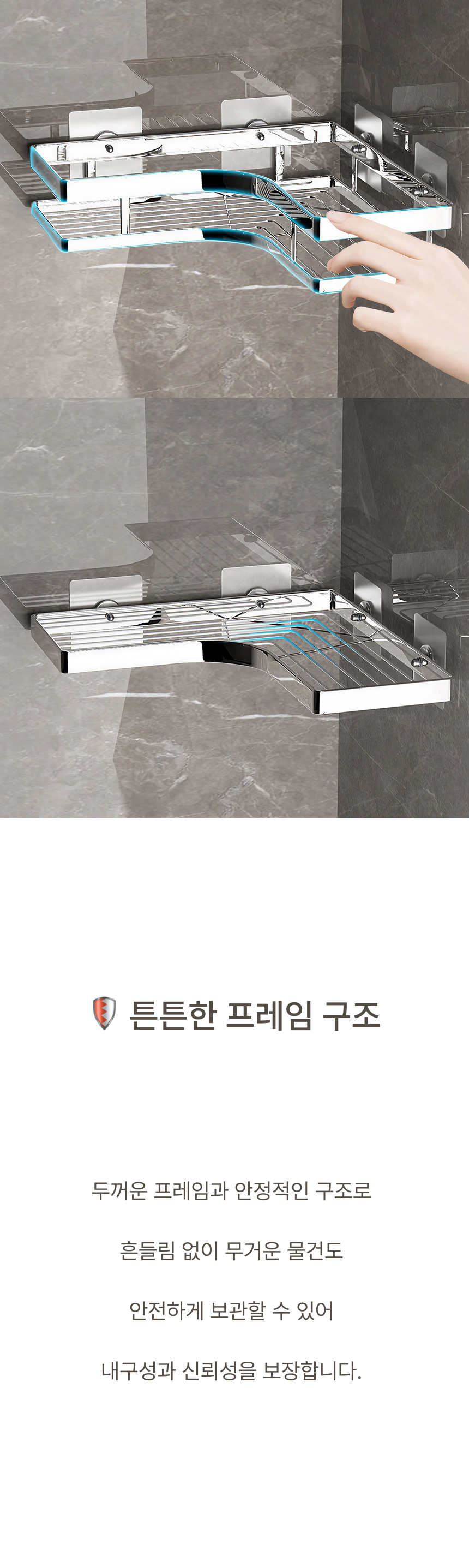 접착 스티커를 부착하는 방식으로 누구나 간편하게 설치할 수 있고 녹이 잘 슬지 않는 스테인리스 소재로 욕실, 주방 등 어디에서나 오랫동안 위생적으로 사용 가능한 스테인리스 코너선반입니다.