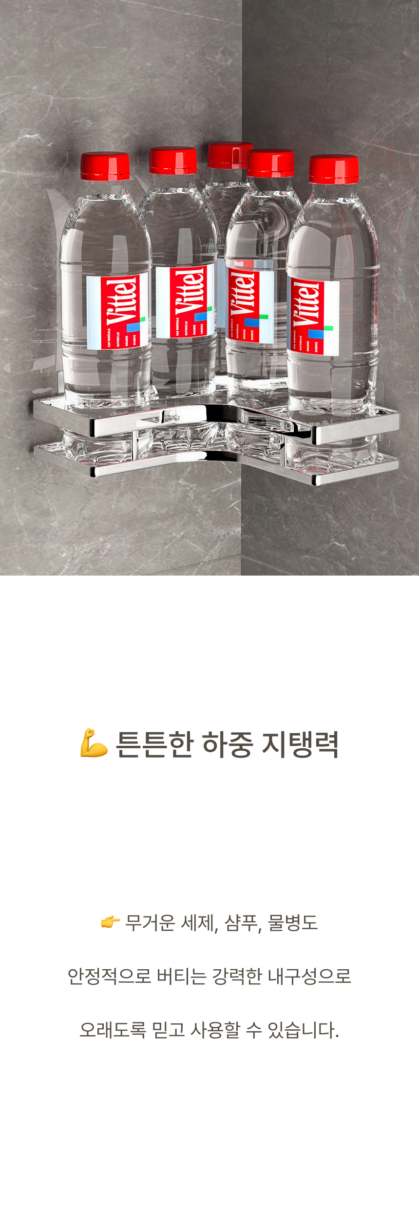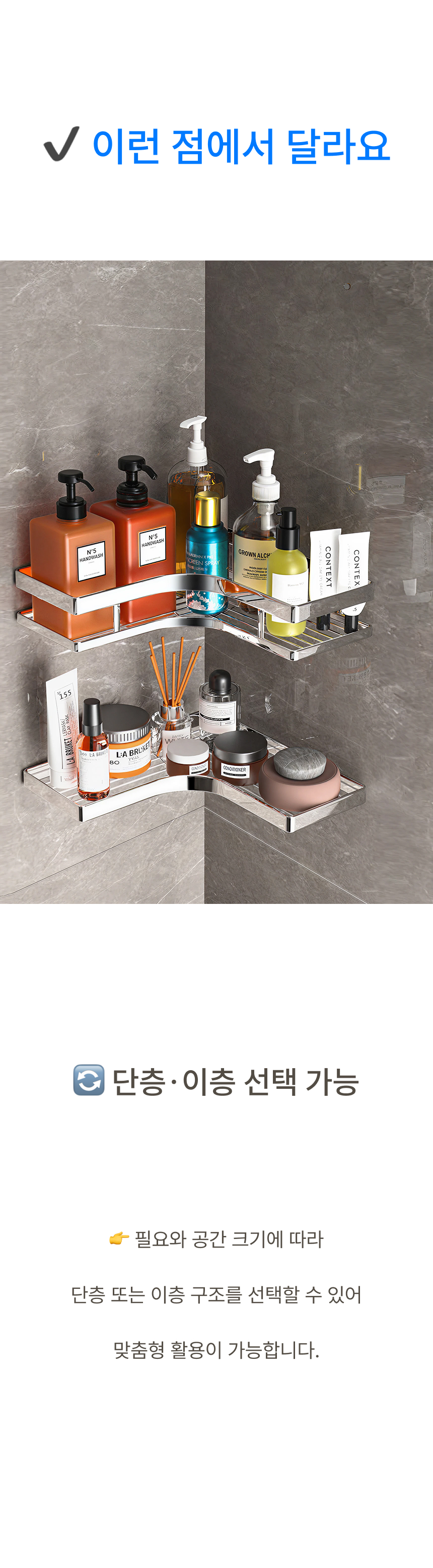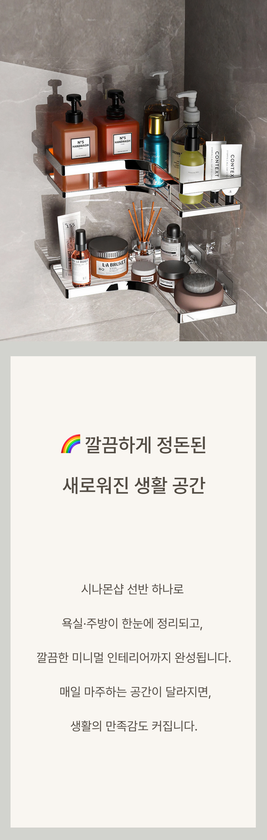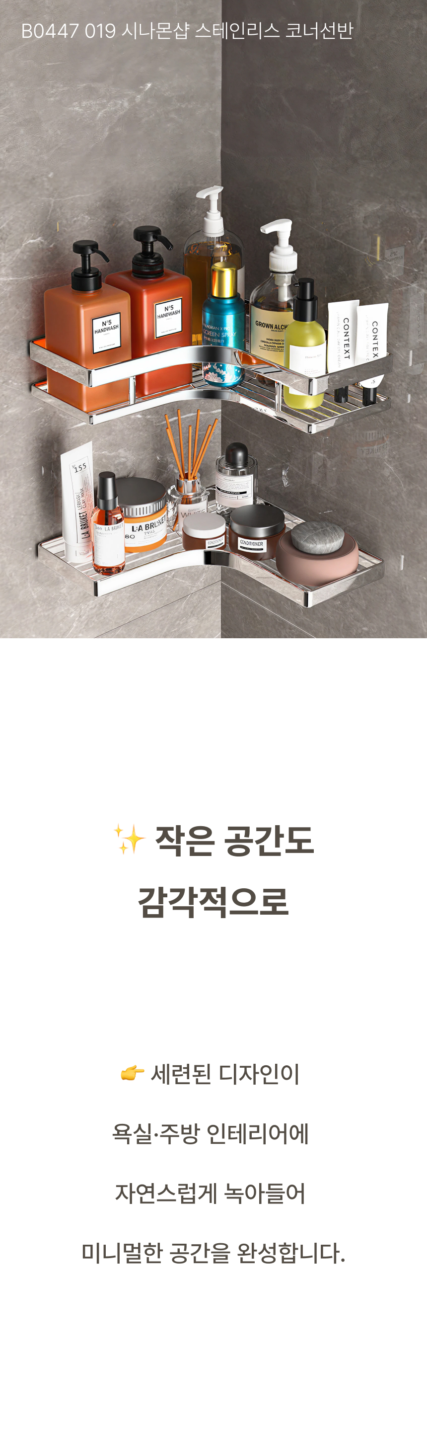 접착 스티커를 부착하는 방식으로 누구나 간편하게 설치할 수 있고 녹이 잘 슬지 않는 스테인리스 소재로 욕실, 주방 등 어디에서나 오랫동안 위생적으로 사용 가능한 스테인리스 코너선반입니다.