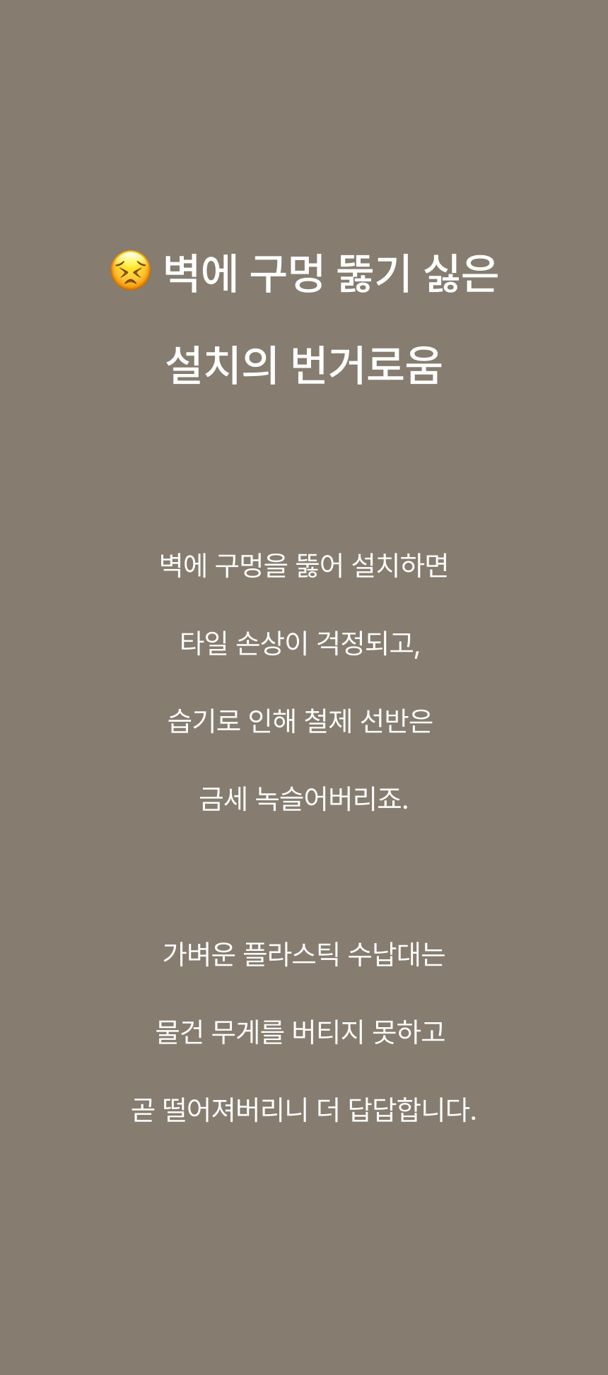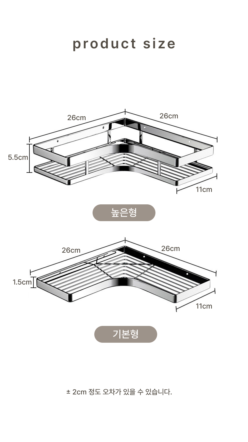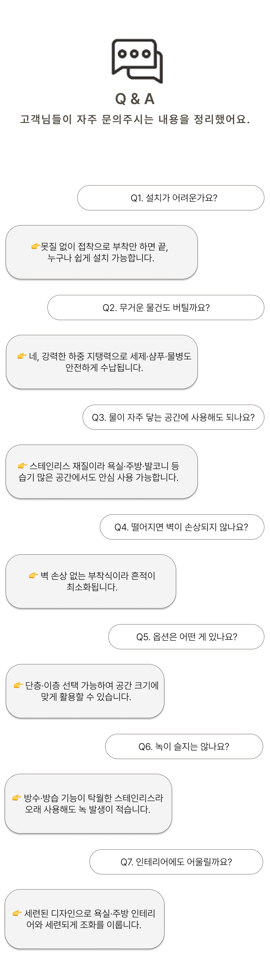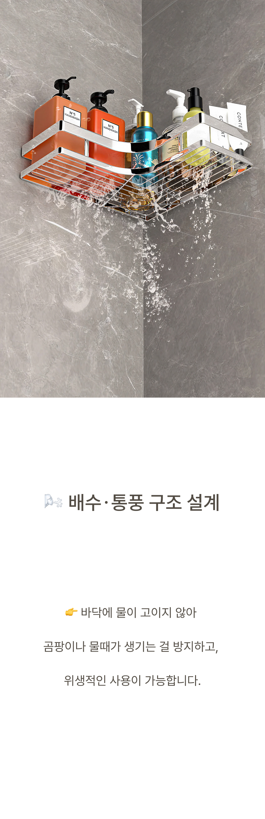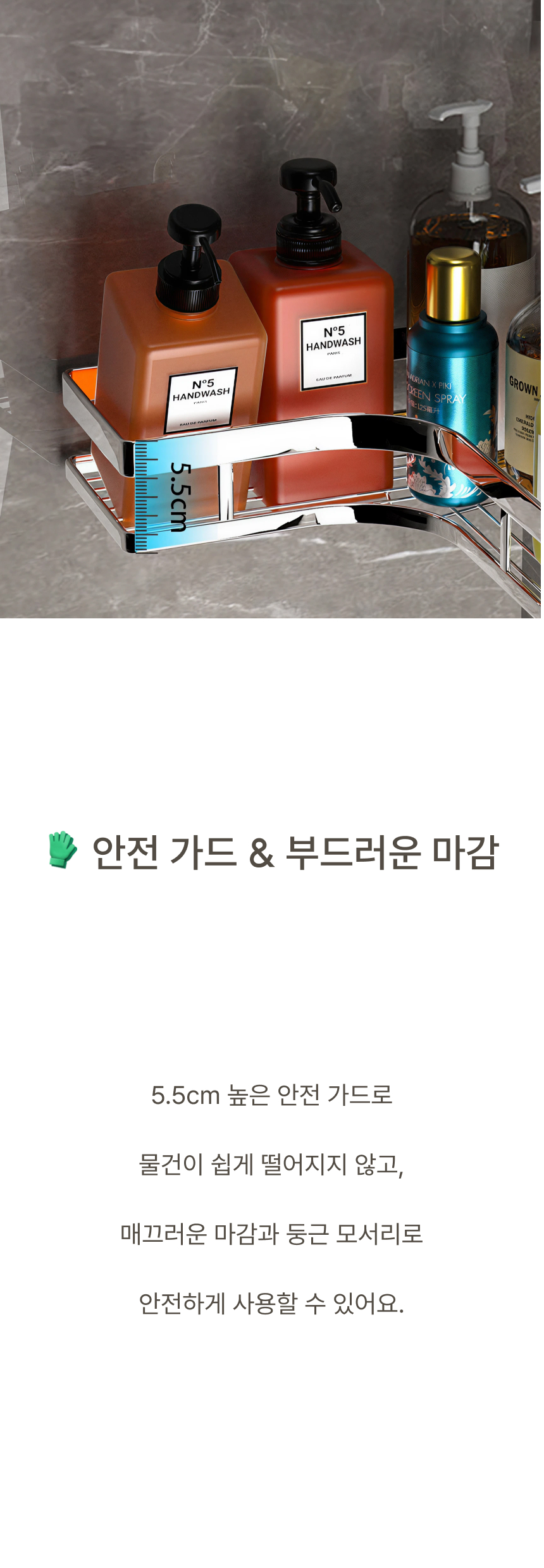 접착 스티커를 부착하는 방식으로 누구나 간편하게 설치할 수 있고 녹이 잘 슬지 않는 스테인리스 소재로 욕실, 주방 등 어디에서나 오랫동안 위생적으로 사용 가능한 스테인리스 코너선반입니다.